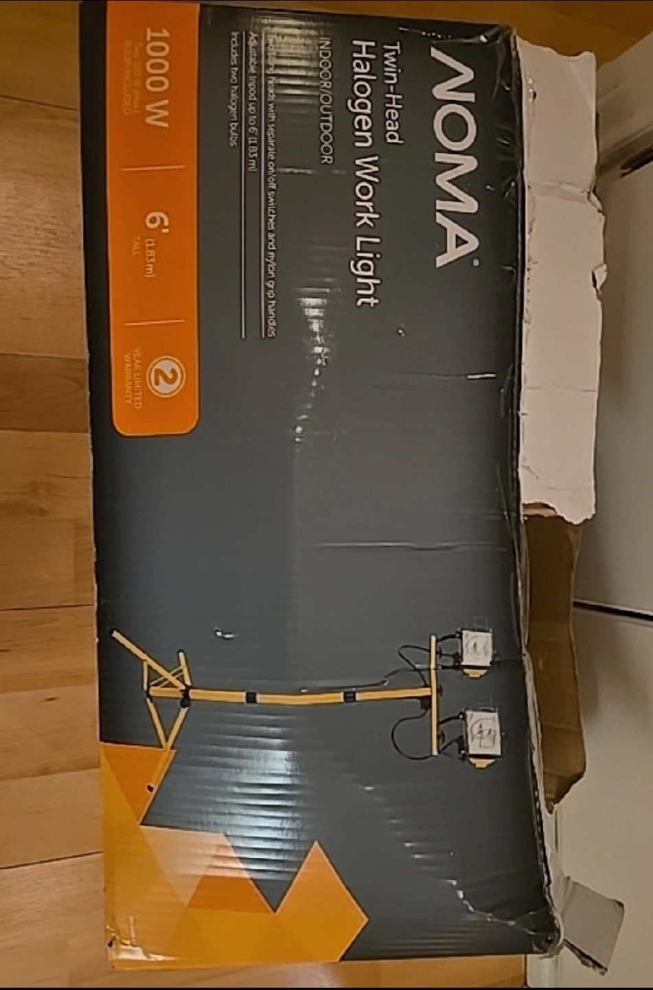 Selling a NOMA Twin-Head Halogen Work Light, perfect for indoor or outdoor use! It has adjustable tripod up to 6' (1.83 m) and includes two halogen bulbs. The box is included!