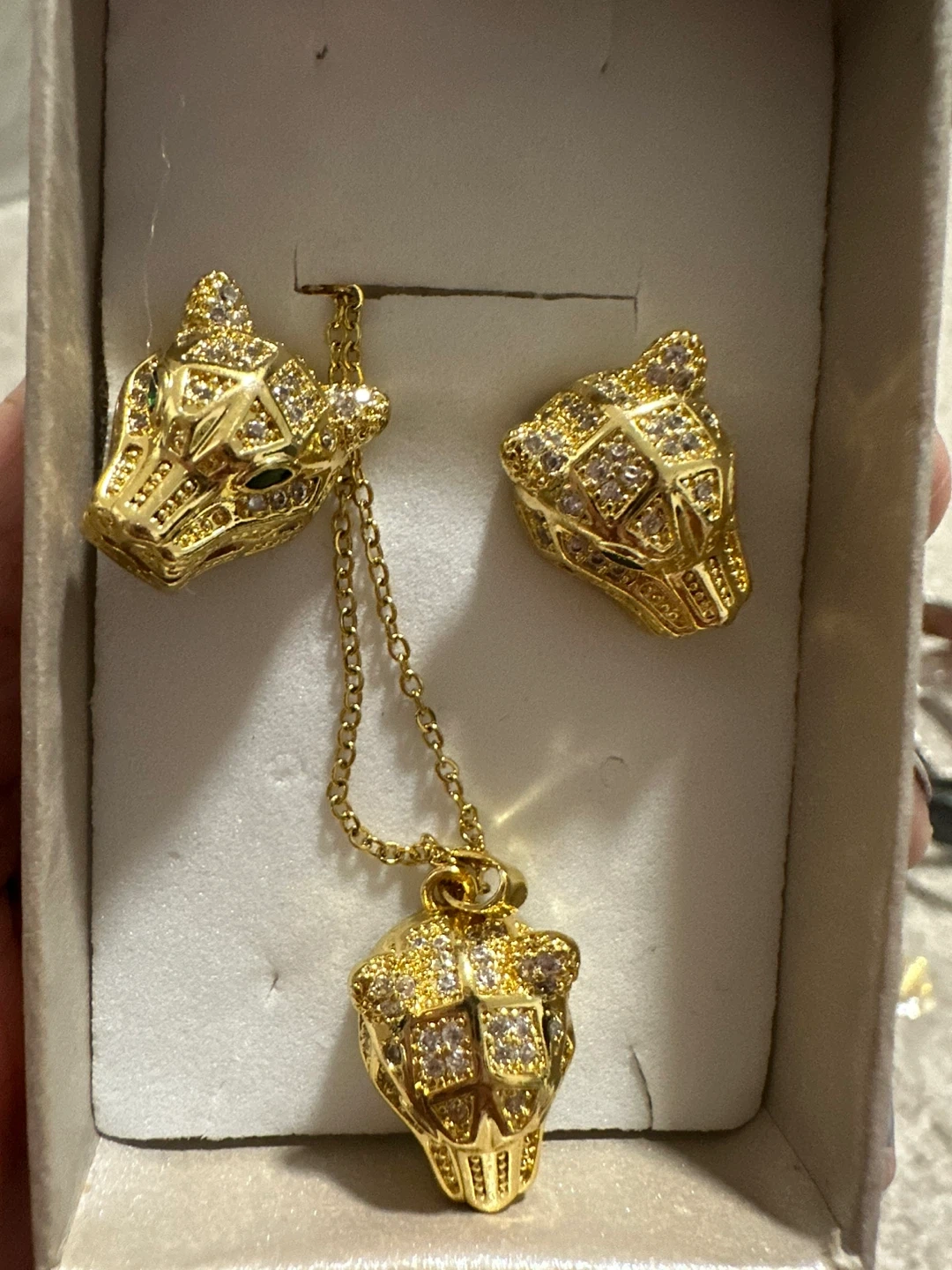 Selling a beautiful gold-toned panther necklace and earring set. It comes in a box, perfect for gifting or keeping it safe. The set features a unique panther design with detailed accents. It's in great condition and ready to add a touch of elegance to your style