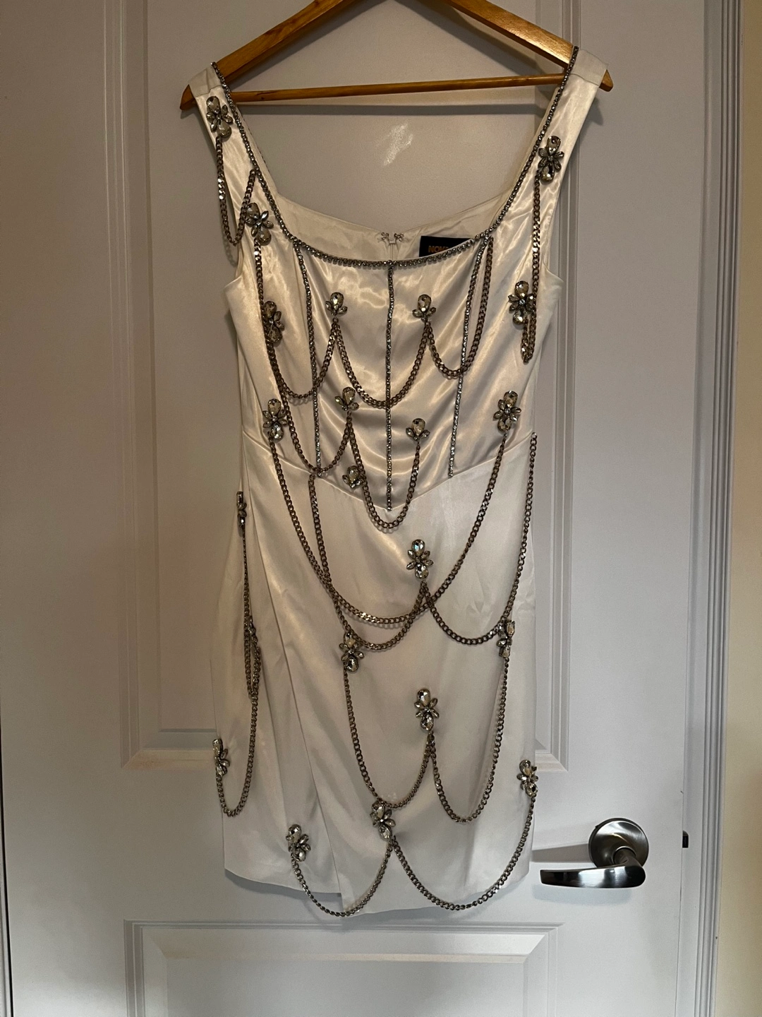 Beautiful Nookie mini dress. Features a white satin-like fabric and silver chains and crystals. Unique design. Sleeveless, scoop neck.