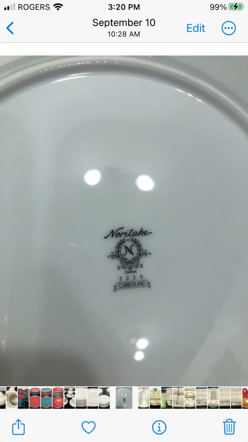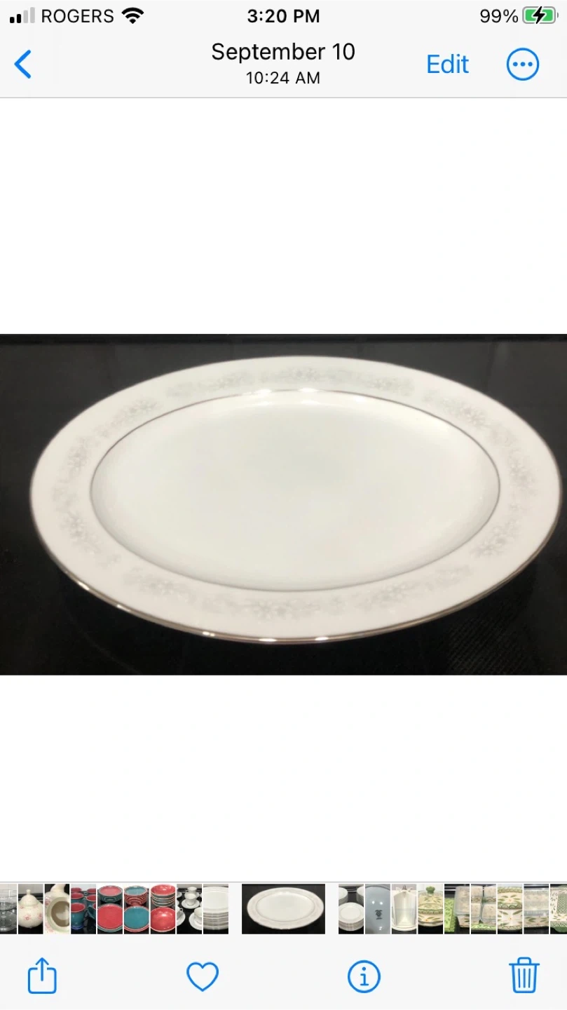 Used like new Pattern: Cumberland (Pattern 2225). Design: Features white floral sprays and misty gray accents, suggesting a lace-like appearance. The design is completed with platinum trim. Material: Translucent white bone china. Production: Produced by Noritake from 1973 to August 1, 2006. Care: The platinum trim makes these plates unsuitable for microwave use. I have eight place settings l, each setting includes: one dinner plate one bowl one salad plate one desert plate one cup and one saucer L also have a 16 inch platter 700 dollars for all OBO Pick up in Chestermere no delivery