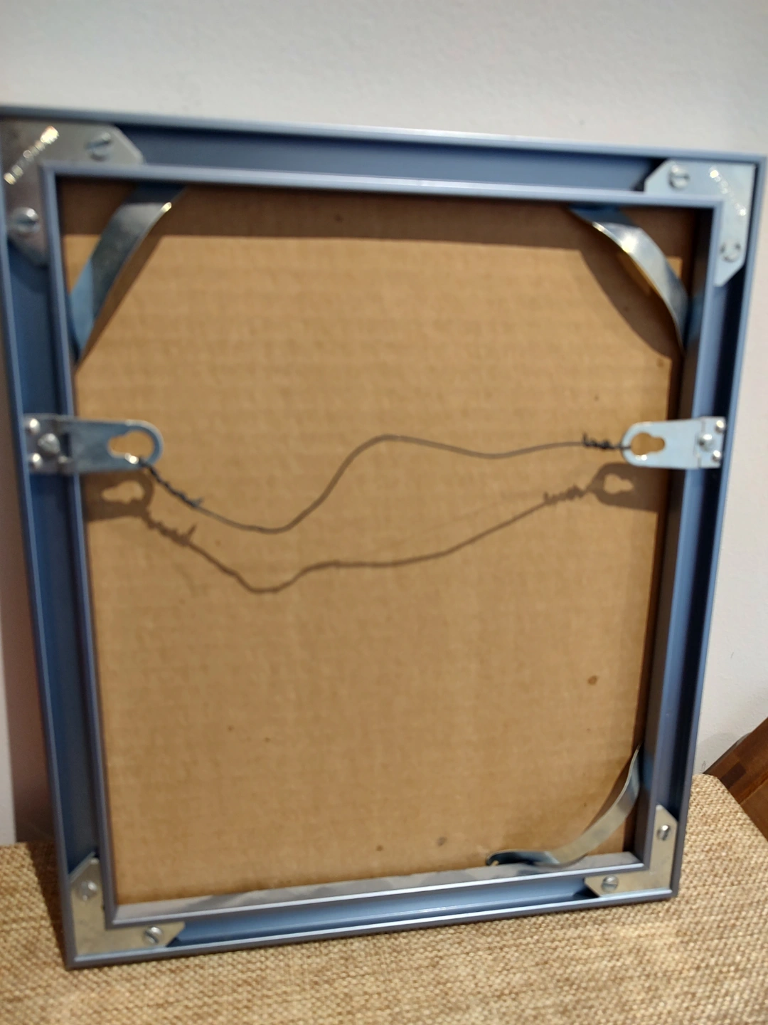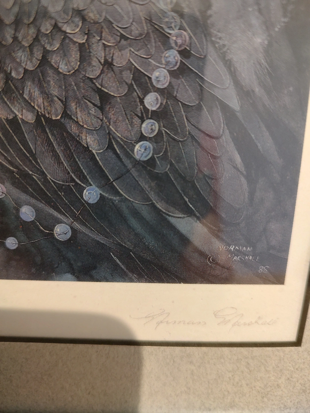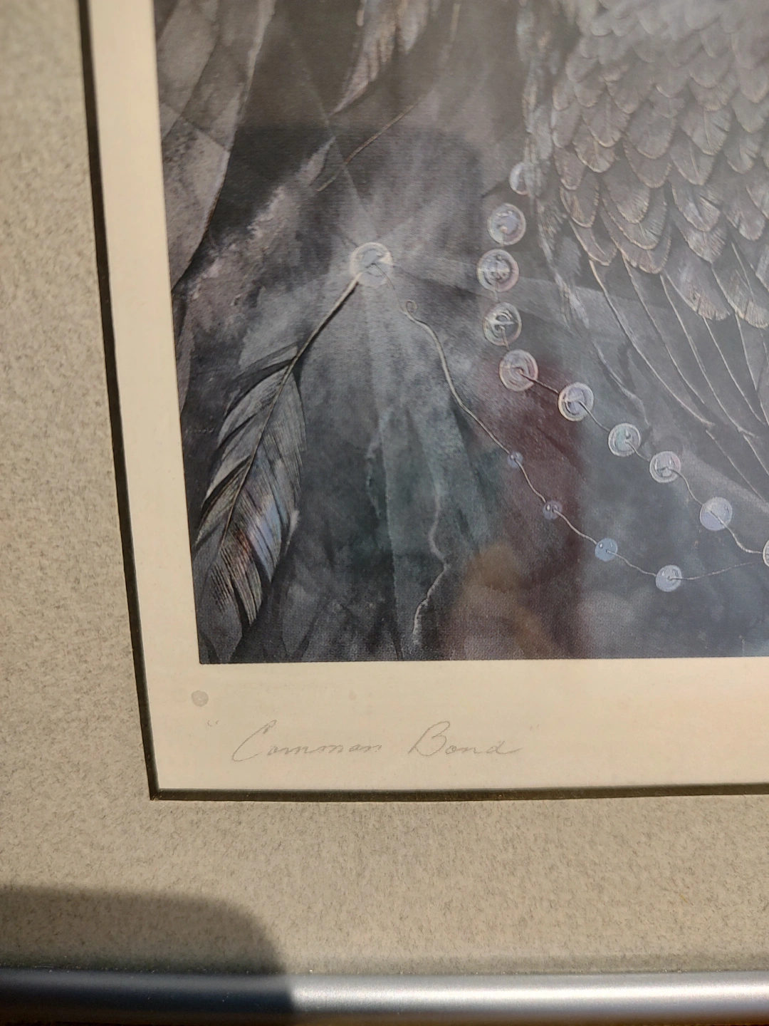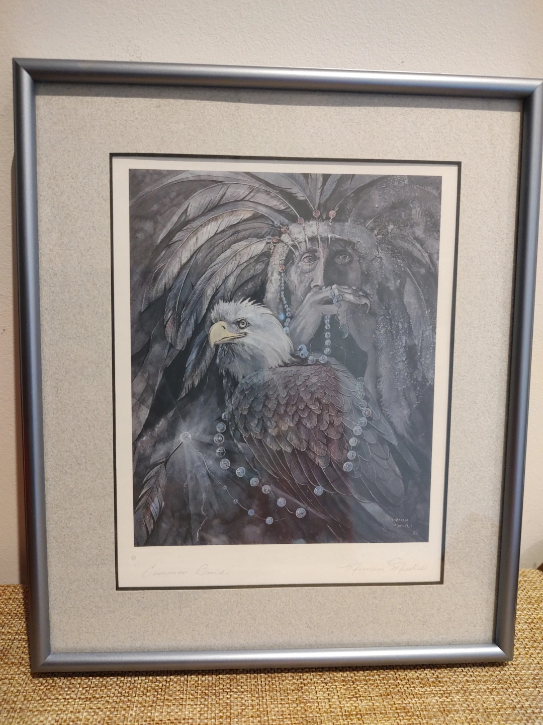 Framed print featuring an eagle and Indigenous person. Blue tones. Silver frame. Hanging hardware. Artist signature. Water colour by Norman Marshall.