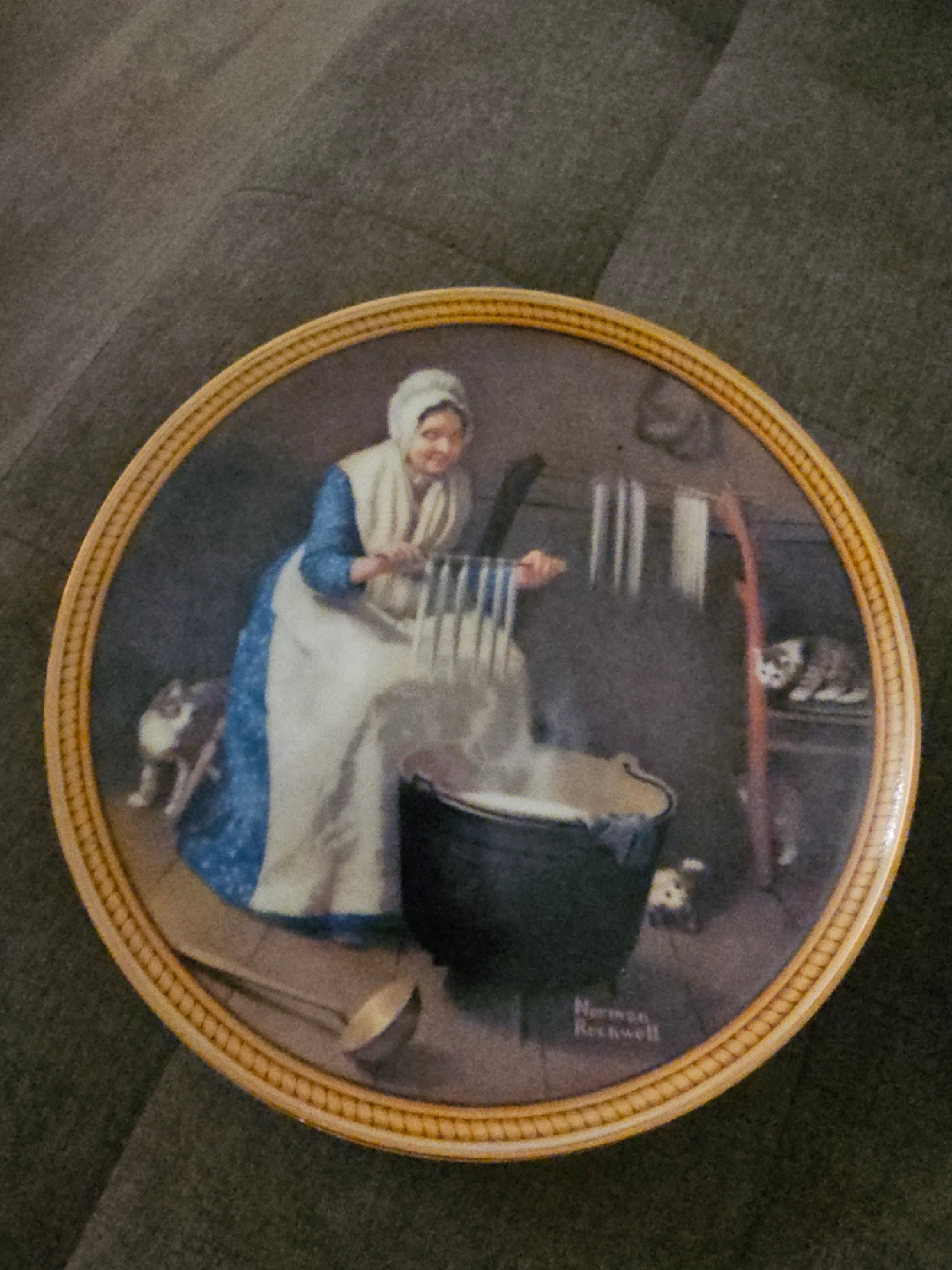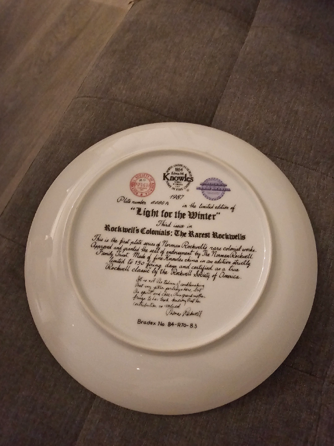 Selling a Norman Rockwell collector's plate from the Knowles series. This one is titled "Light for the Winter" and is the third issue in the Rockwell's Colonials collection. It's a rare Rockwell work approved and granted the art of arrangement by The Norman Rockwell Family Trust. Made of fine Knowles china and an edition strictly limited to 150 firing days and certified as a true Rockwell classic by the Rockwell Society of America.