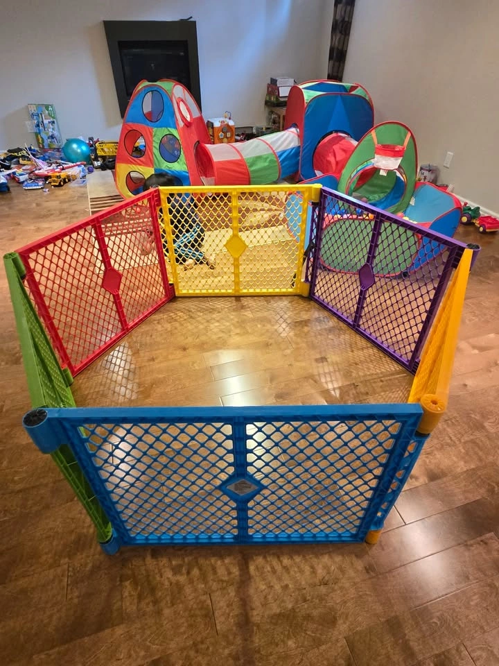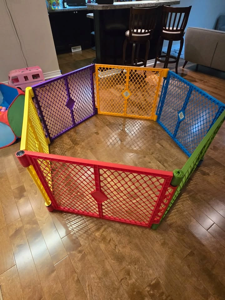 This North States Superyard Colorplay playard is a versatile and colourful play space for your little one, featuring six interlocking panels that create a safe play area. This playard is in used but good condition. Here are some specifications: * Easy to set up * Can be used indoors or outdoors * Folds up for easy storage and transport * Made of durable, weather-resistant plastic I've priced this one at $90 to reflect its condition and features. If you're seeing this ad, it means the playard is still available!