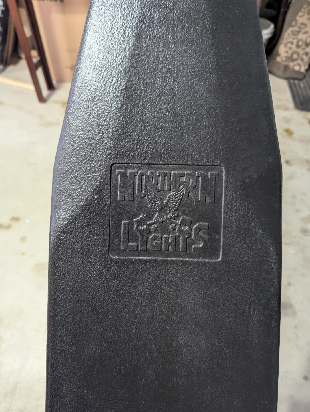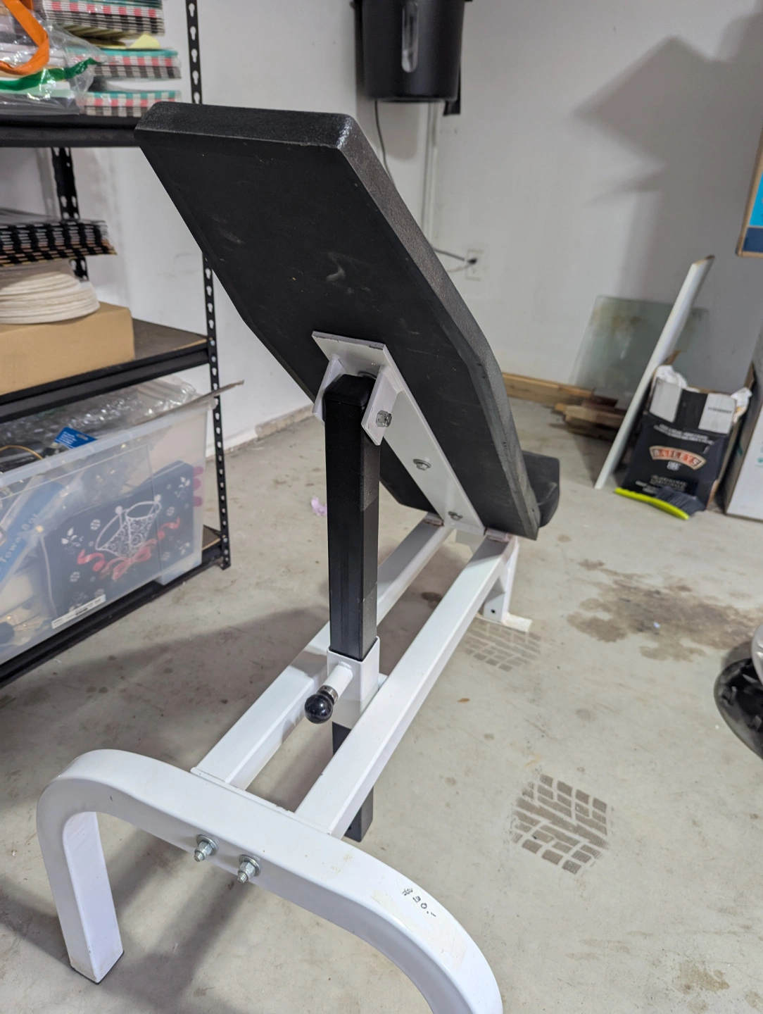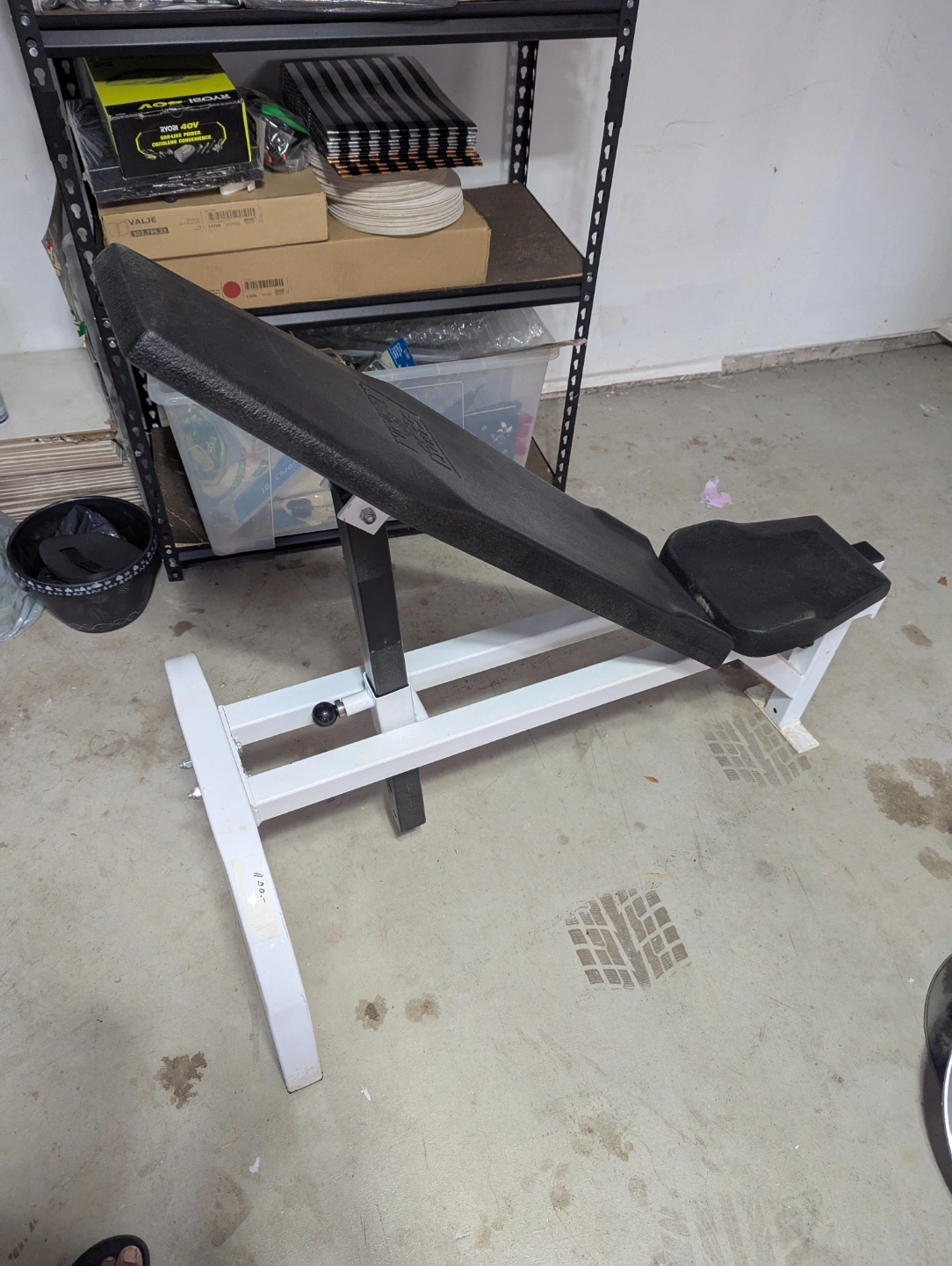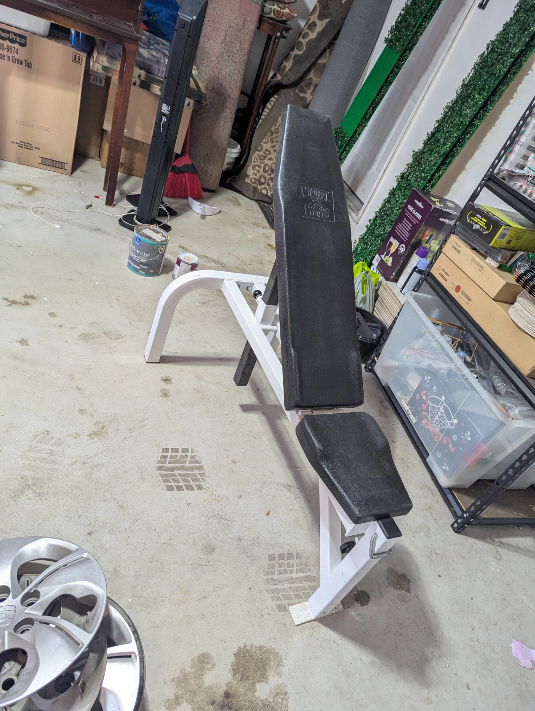Adjustable weight bench. White frame, black padded seat and back. Good for home gym use.