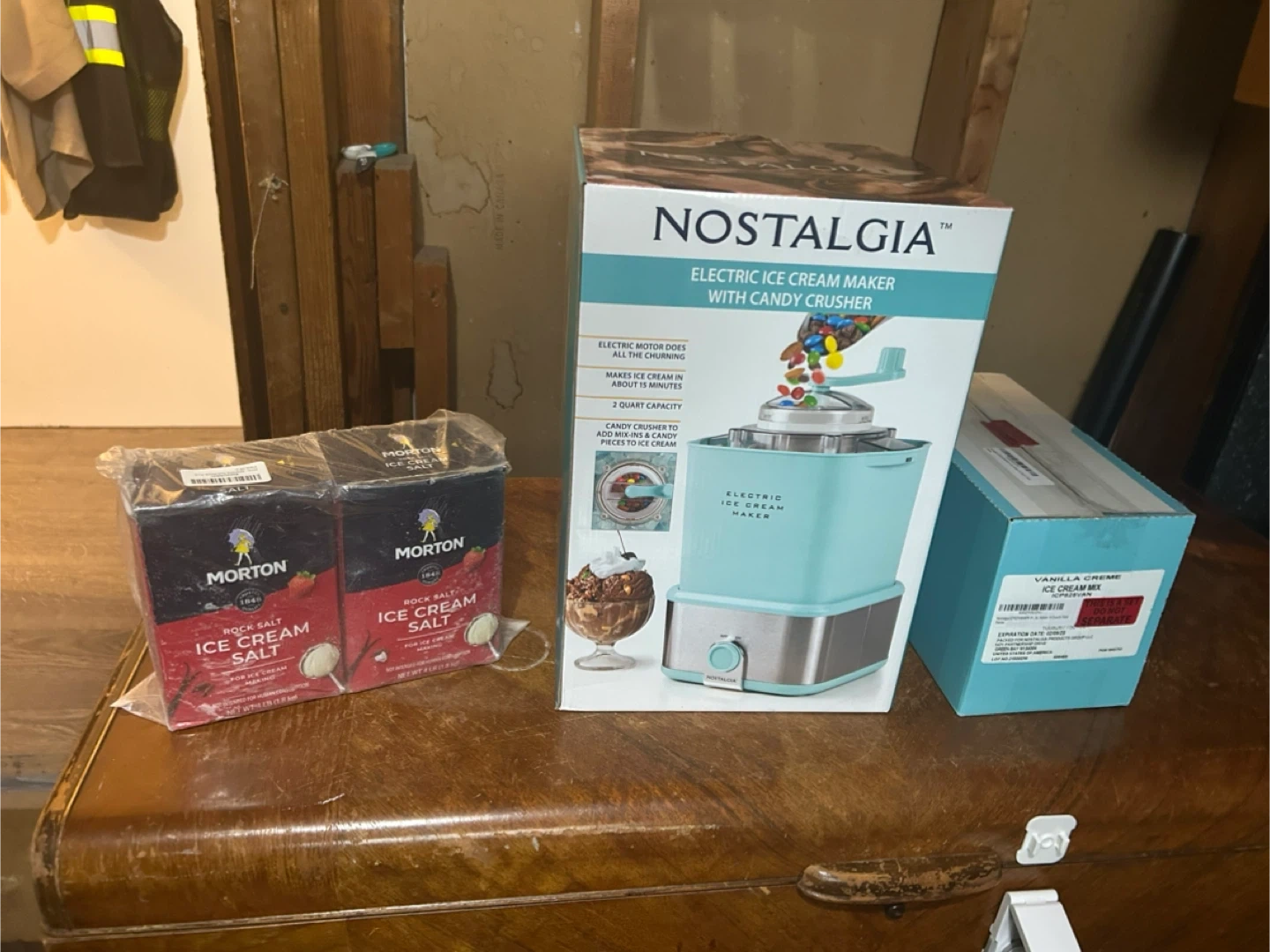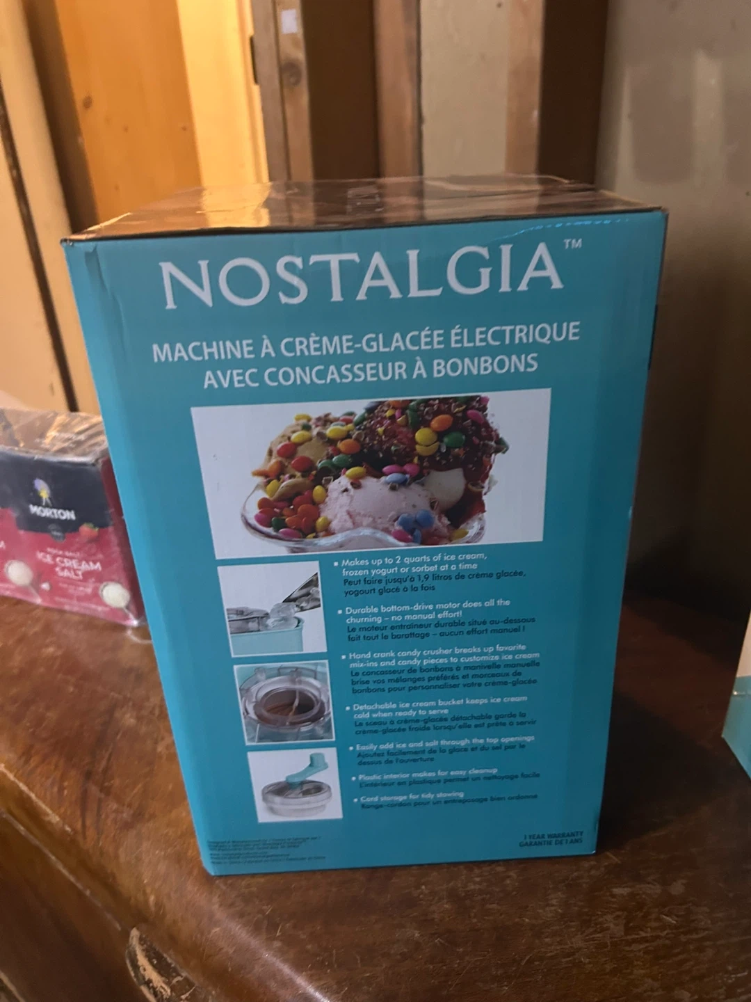 Get ready to make some delicious homemade ice cream with this Nostalgia electric ice cream maker! It even has a built-in candy crusher for extra fun. It makes ice cream in about 15 minutes and has a 1 quart capacity. The box is included