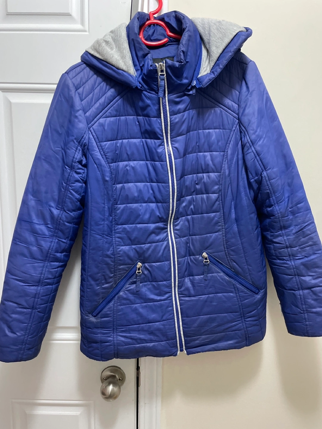 Women's blue quilted jacket. Features a hood with grey lining. Two zippered pockets. Size L/G. Smoke free and pet free home