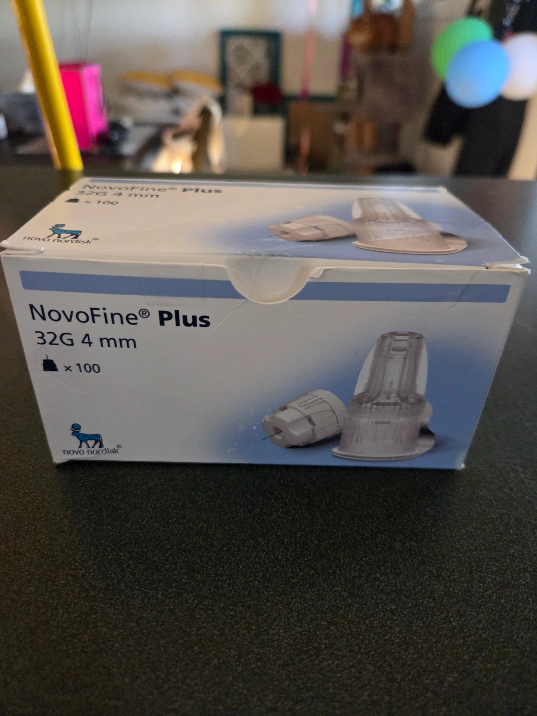 Box of 100 NovoFine Plus pen needles. 32G and 4 mm in length. Comes with sharps container.