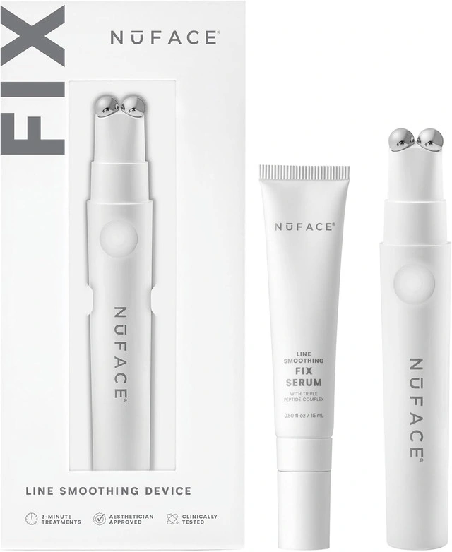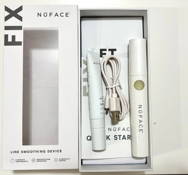 This kit gently stimulates your skin to help reduce the appearance of fine lines and wrinkles. It includes the FIX device, serum, and charging cable. Additional details: * Includes: NuFACE FIX device, FIX Serum (almost full), charging cable * Helps improve skin texture and tone * Portable and easy to use * Perfect for on-the-go treatments This kit is only used a few times. If the ad is up, it's available!