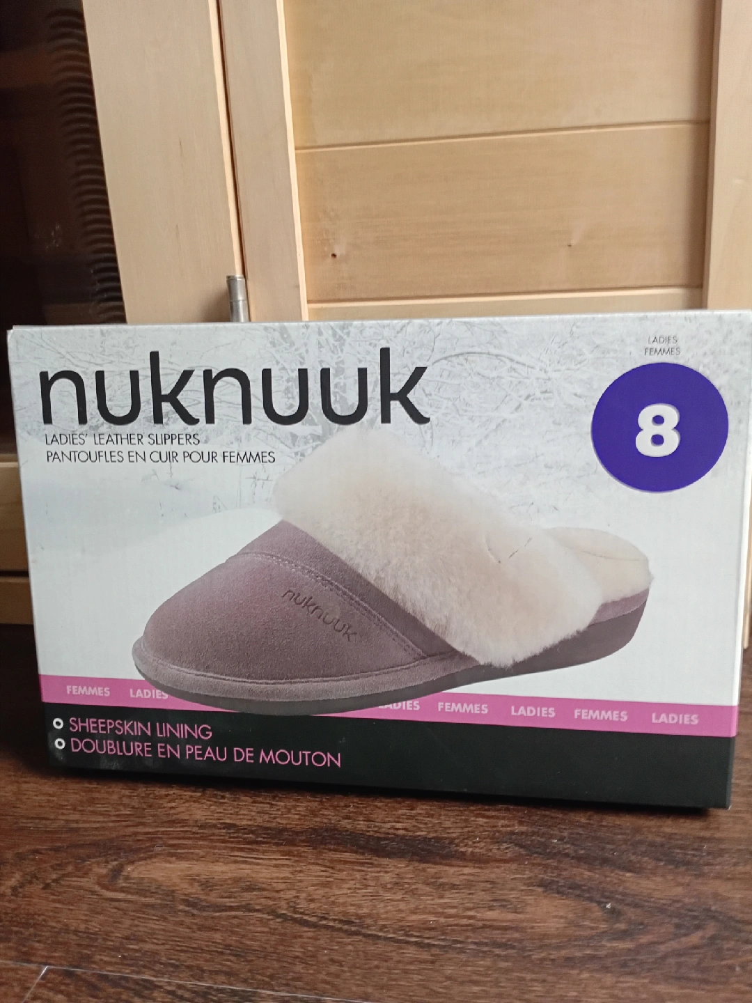 Selling a pair of nuknuuk ladies' leather slippers in size 8! They feature a sheepskin lining for extra comfort. The slippers come in their original box, making them perfect for gifting or keeping them neatly stored..slippers have never been worn.