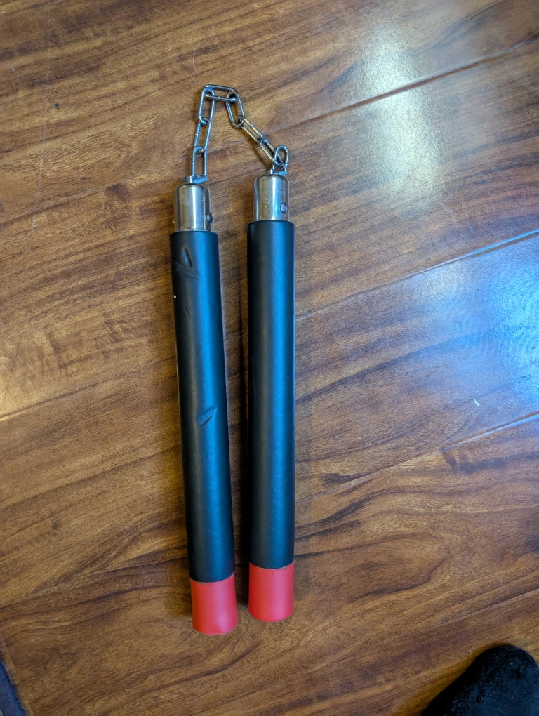Selling a pair of nunchucks. They are black with red ends and a metal chain. There are some scratches on the surface, as shown in the pictures