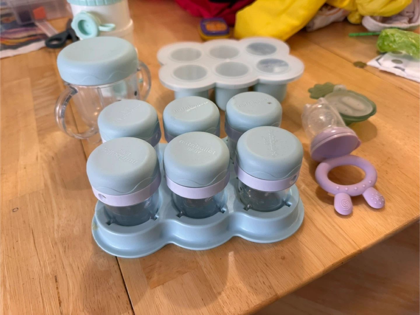 Nutribullet Baby food storage set includes: - 6 small storage cups with lids - 1 large storage cup with lid - 2 freezer trays - 1 food feeder - 1 teether