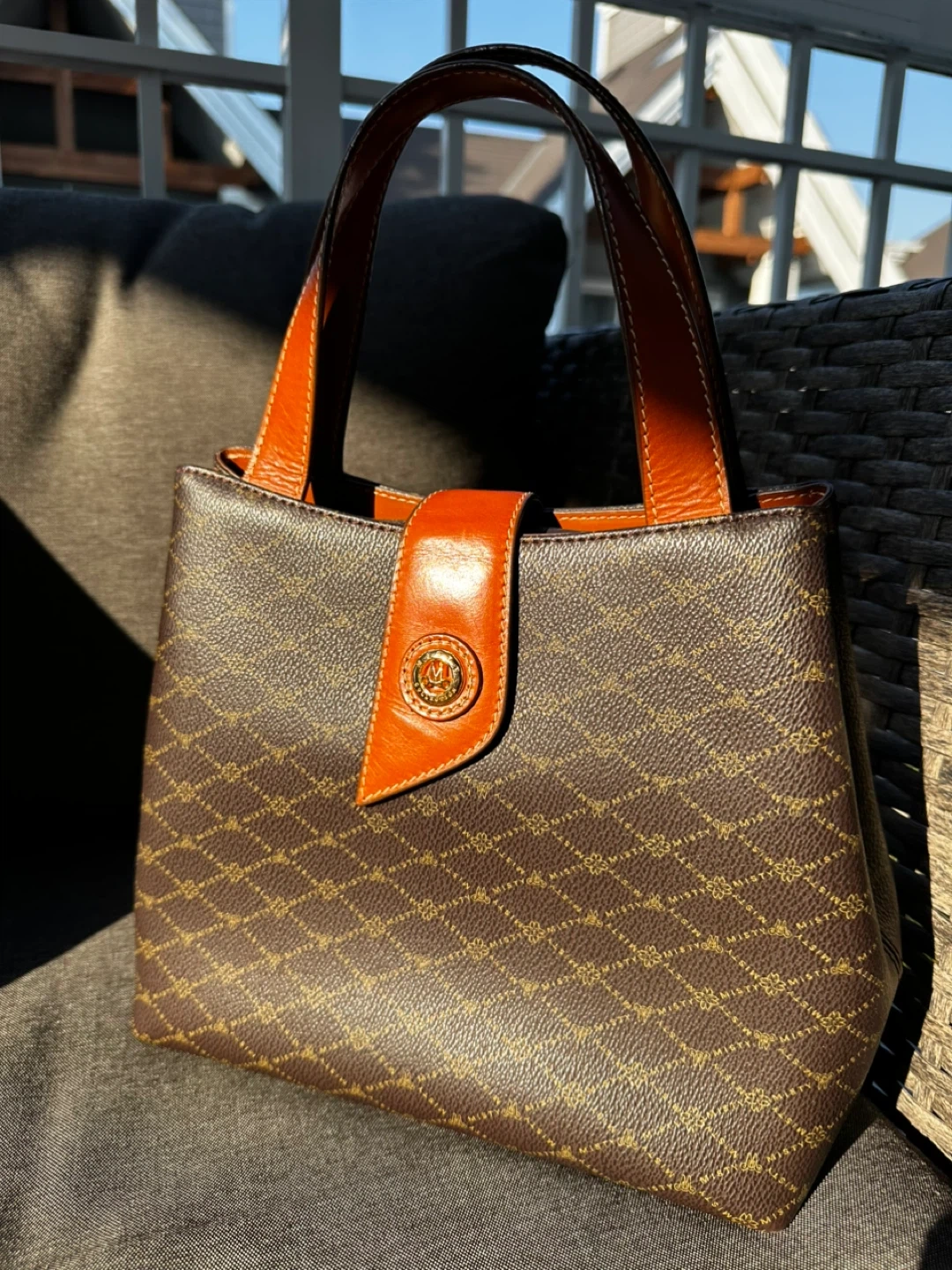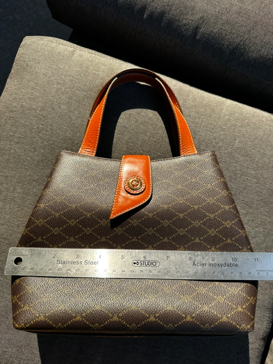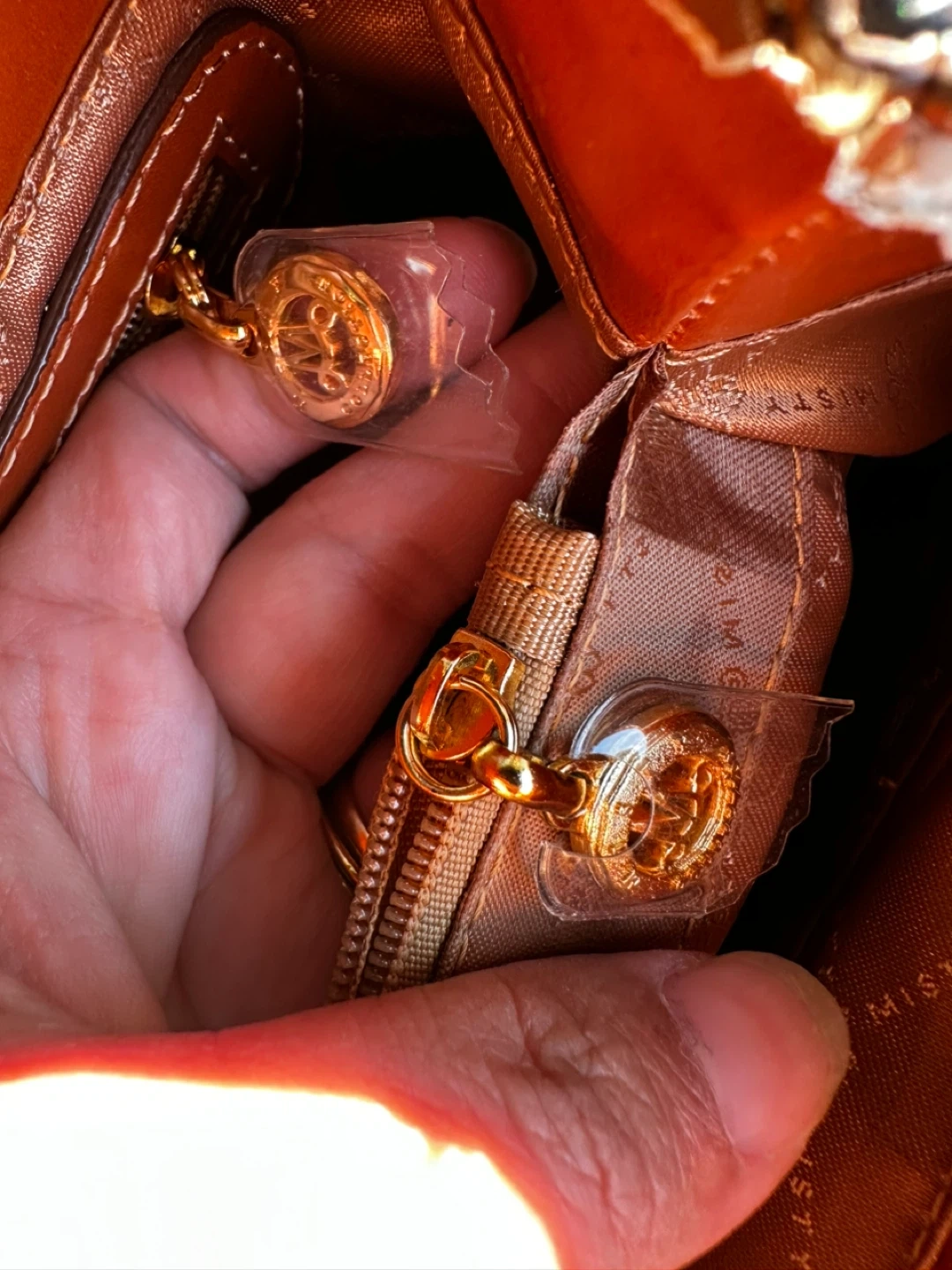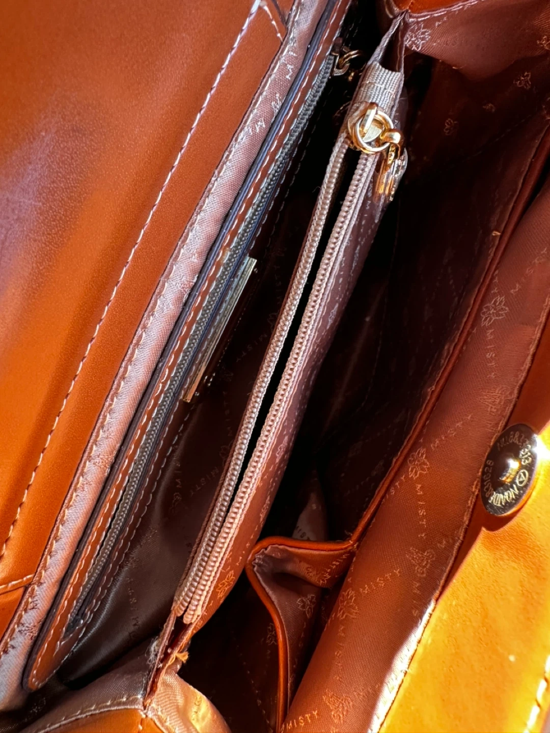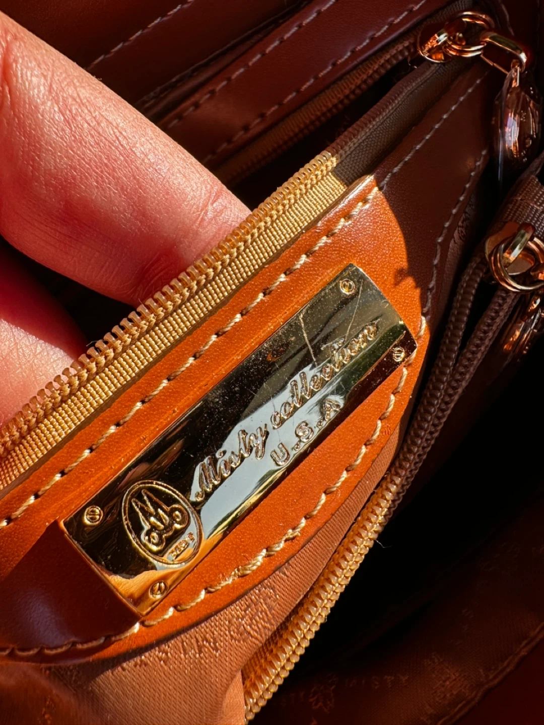 Selling a cute Misty Collection U.S.A. handbag! It's brown leather with orange accents. The bag measures approximately 10 inches in length. Self pickup at Coquitlam Parkway Blvd