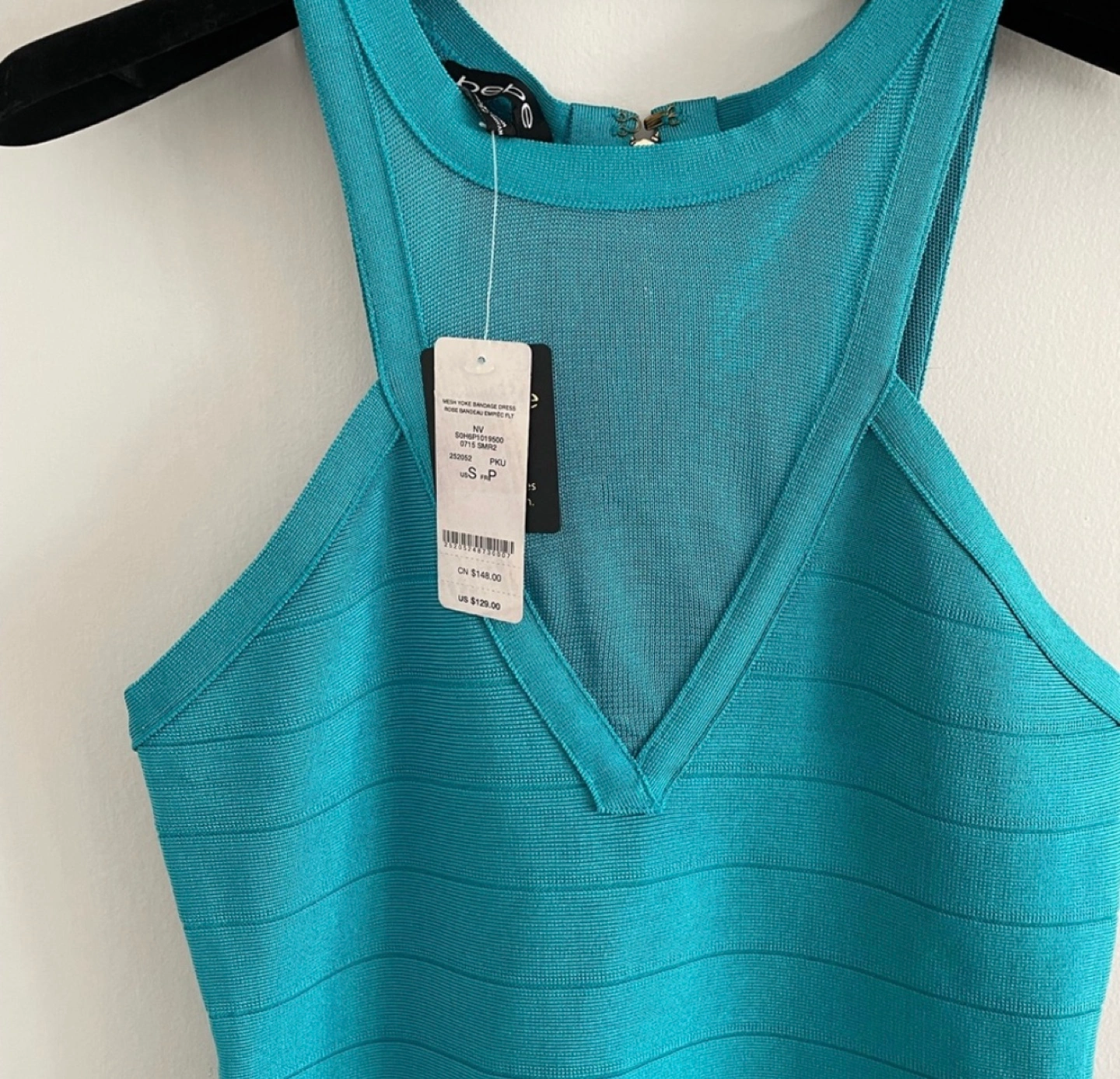 Features a halter neckline with mesh inset. Bodycon silhouette. Zip closure at back. New with tags. Never worn. Excellent condition.