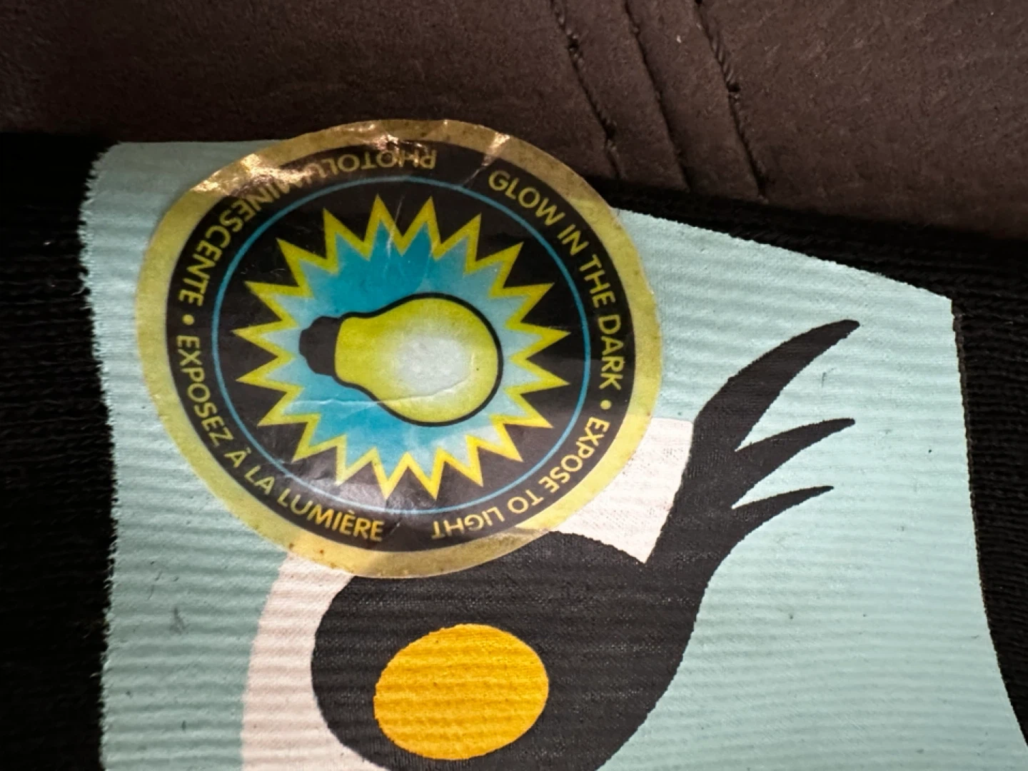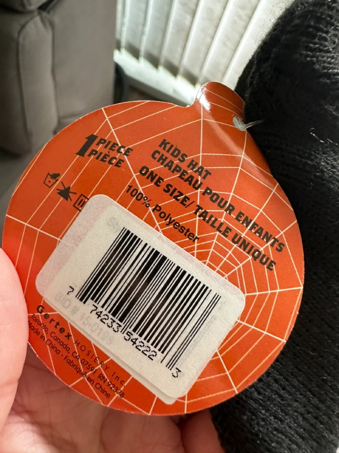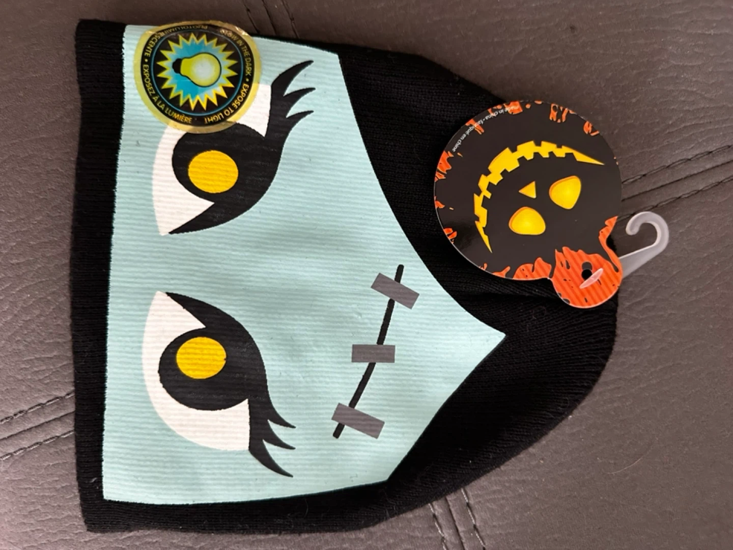 This is a fun kids' Halloween hat that glows in the dark! It's made of 100% polyester and is one size fits all. It features a spooky design and has a photoluminescent sticker. Self pickup at Coquitlam Parkway Blvd