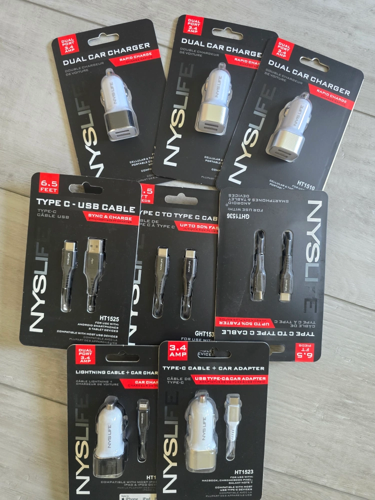 Selling a variety of NYSLIFE car chargers and USB cables, all brand new in their original packaging! Perfect for charging your devices on the go. - Dual car chargers (3.4 AMP) - Type-C to USB cables (6.5 feet) - Lightning cable + car charger - Type-C cable + car adapter