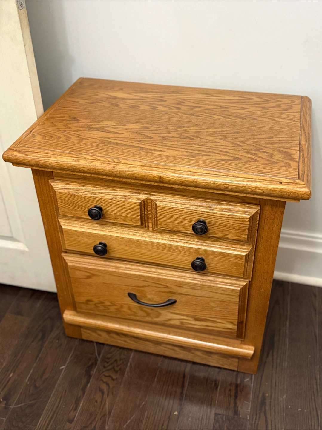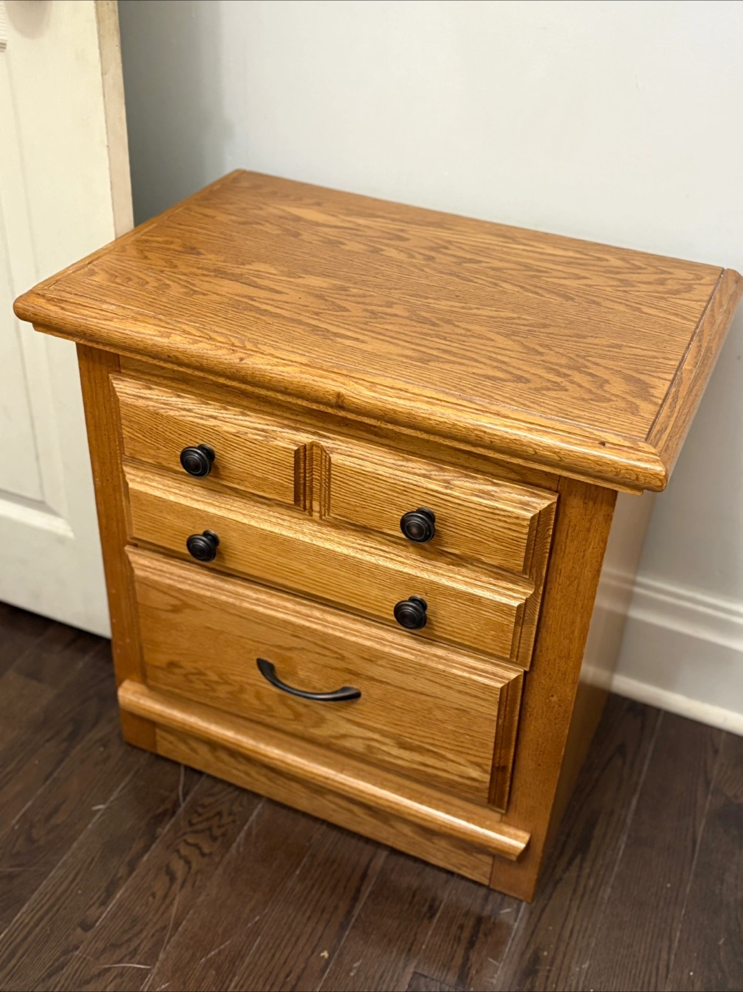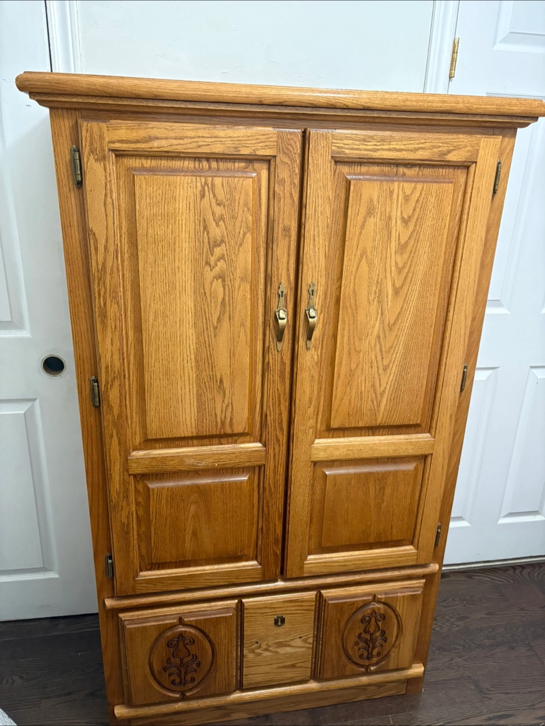 Selling a matching oak armoire and nightstand set. Both pieces feature a classic design with beautiful wood grain. The armoire provides ample storage space, while the nightstand offers convenient bedside storage with drawers. Great for adding a touch of warmth and functionality to any bedroom!