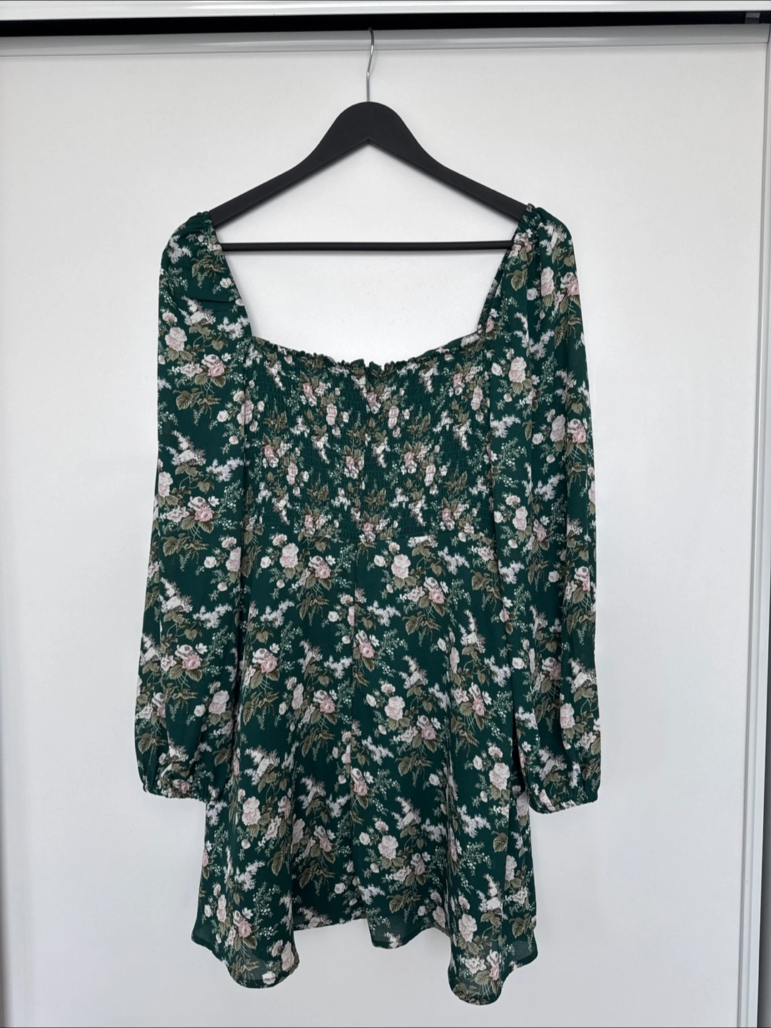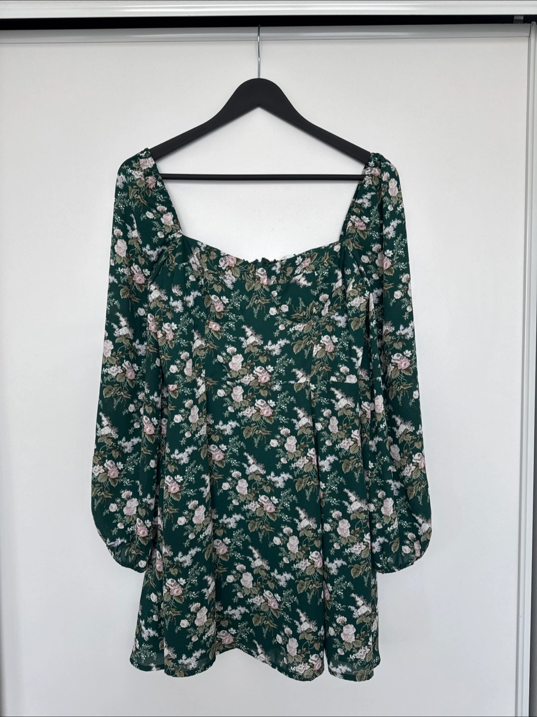 Emerald green floral mini dress. Long puff sleeves, sweetheart neckline. Details in pictures Worn once