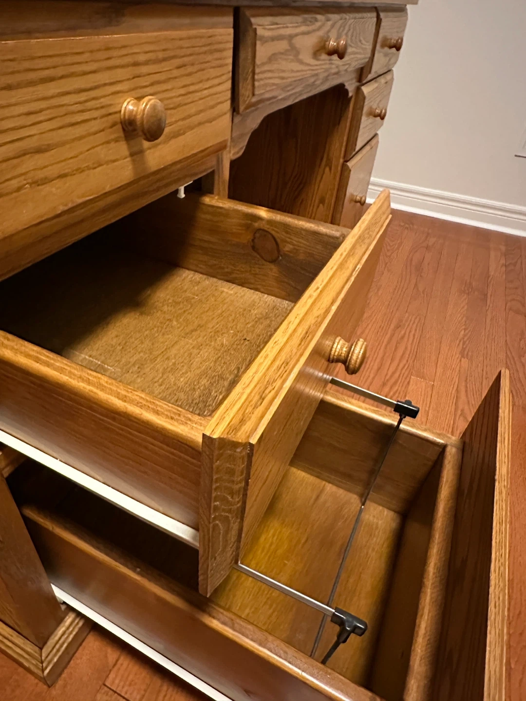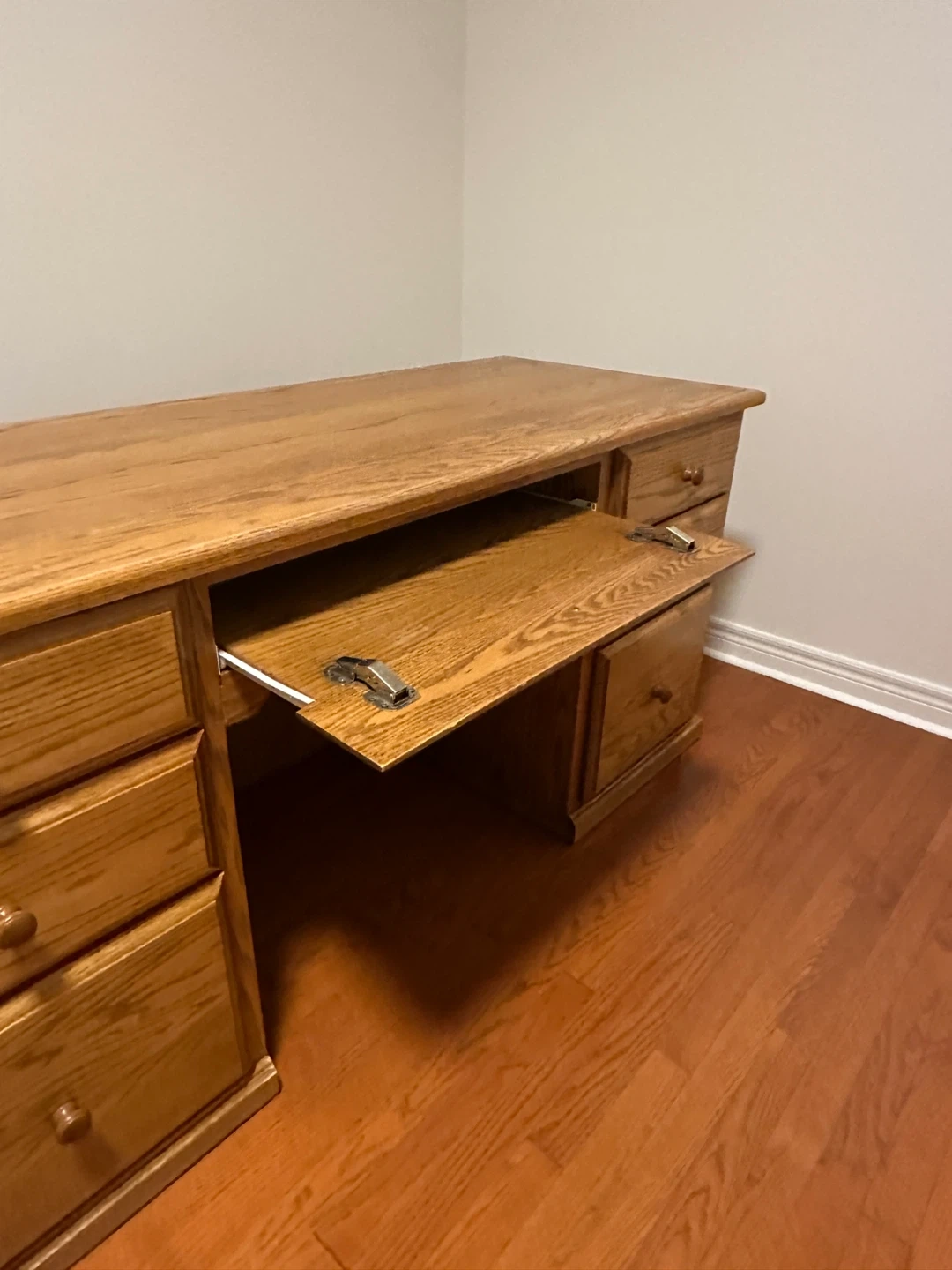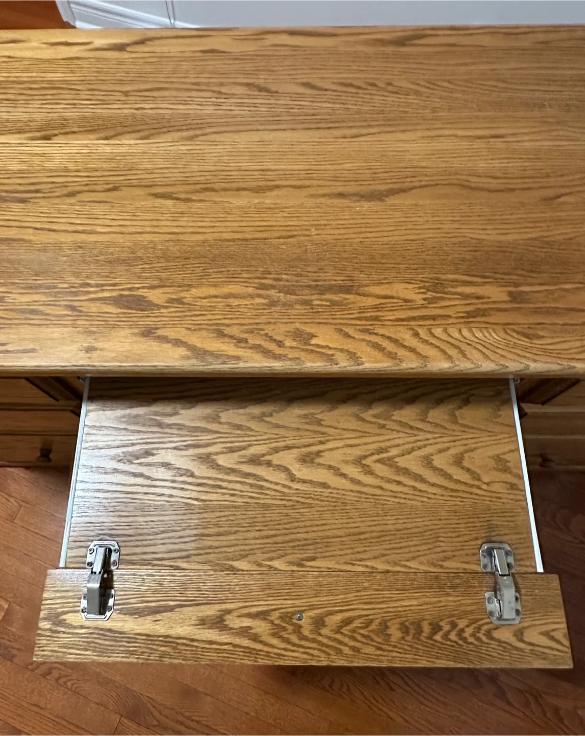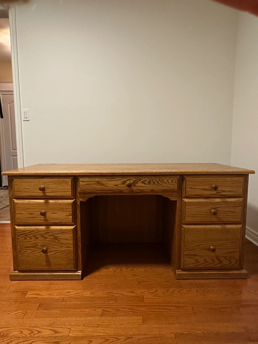 Solid oak with solid pine drawers. Desk with six drawers, two with file folder ability, and centre key board drawer. Width 65.5 inches Depth 24.5 inches Height 30.5 inches Leg room height 24 inches Legroom depth 23 inches