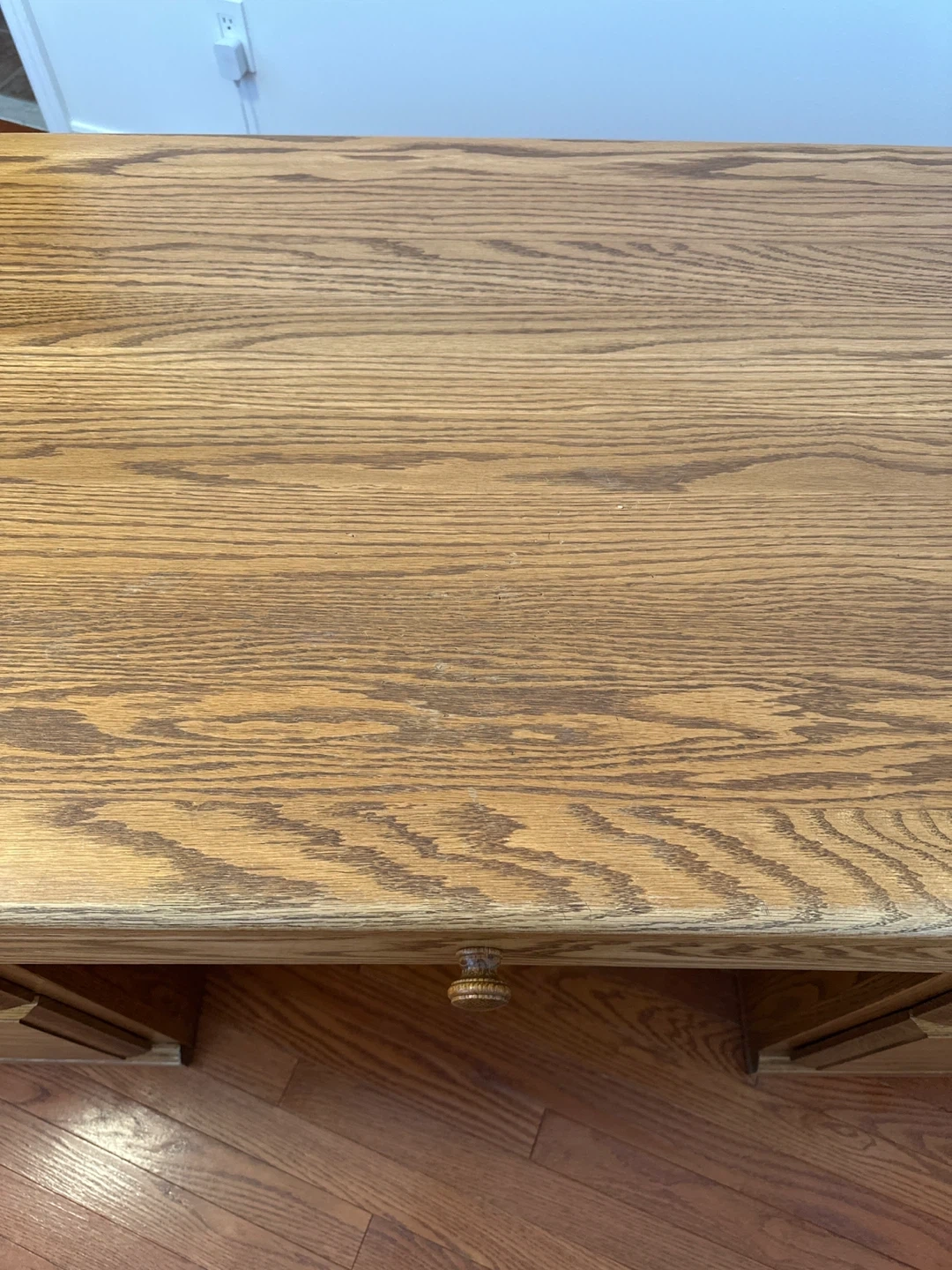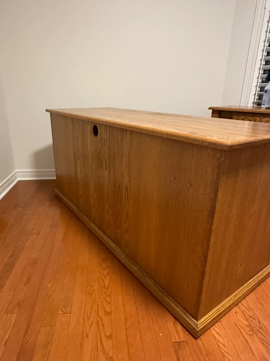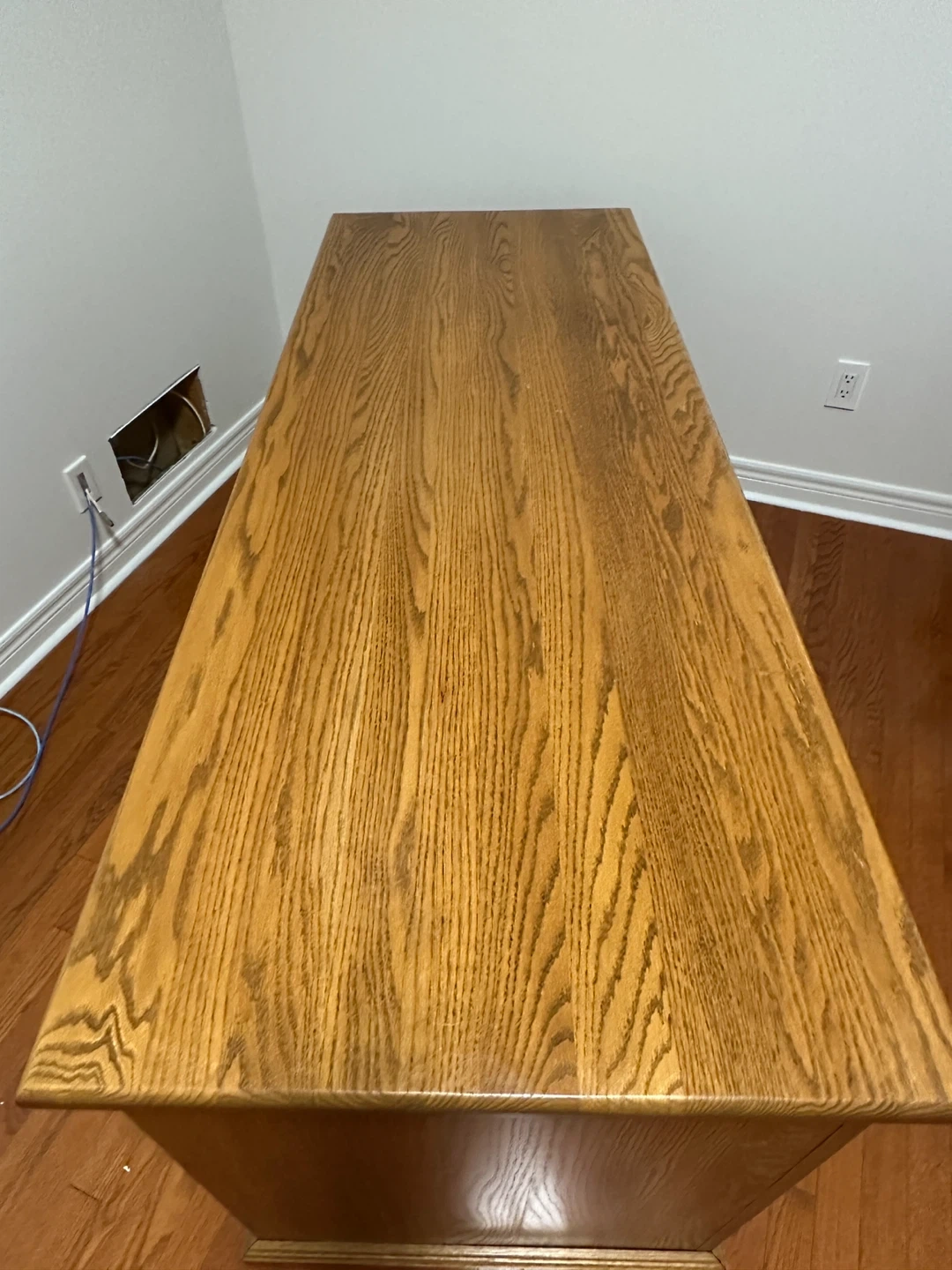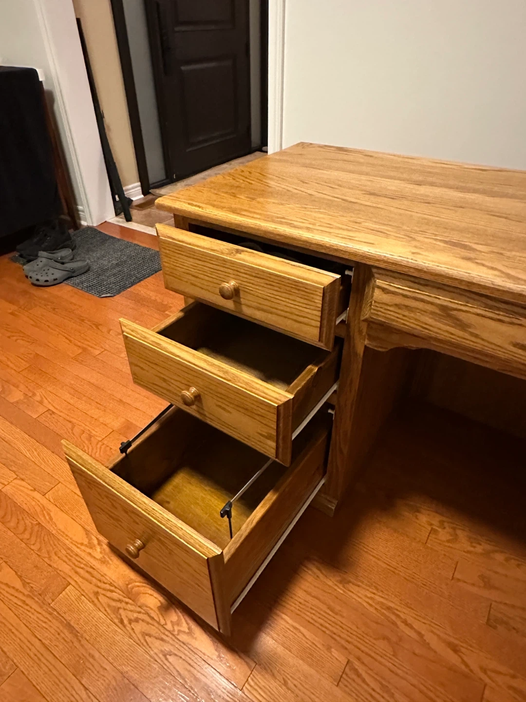 Solid oak with solid pine drawers. Desk with six drawers, two with file folder ability, and centre key board drawer. Width 65.5 inches Depth 24.5 inches Height 30.5 inches Leg room height 24 inches Legroom depth 23 inches