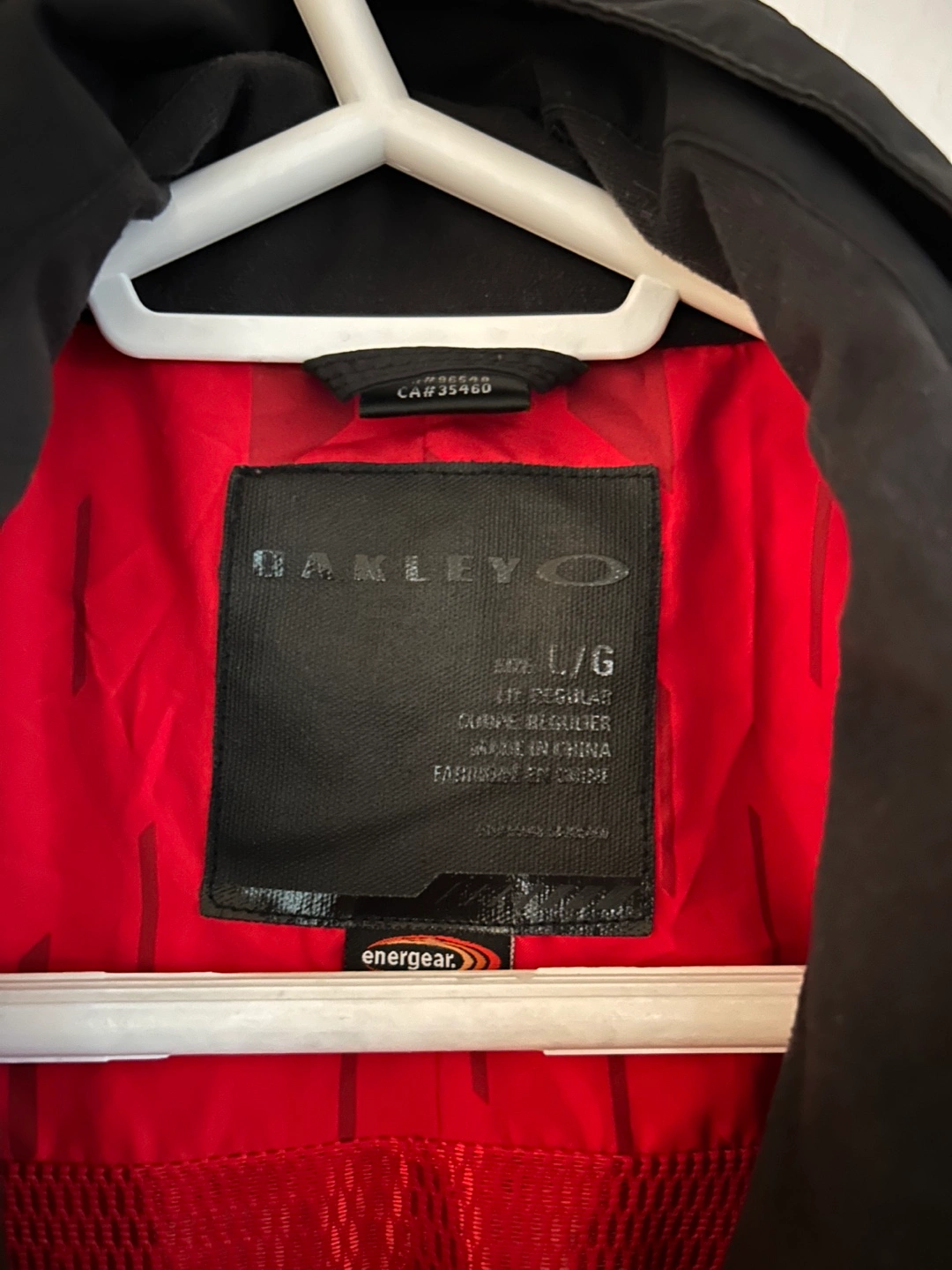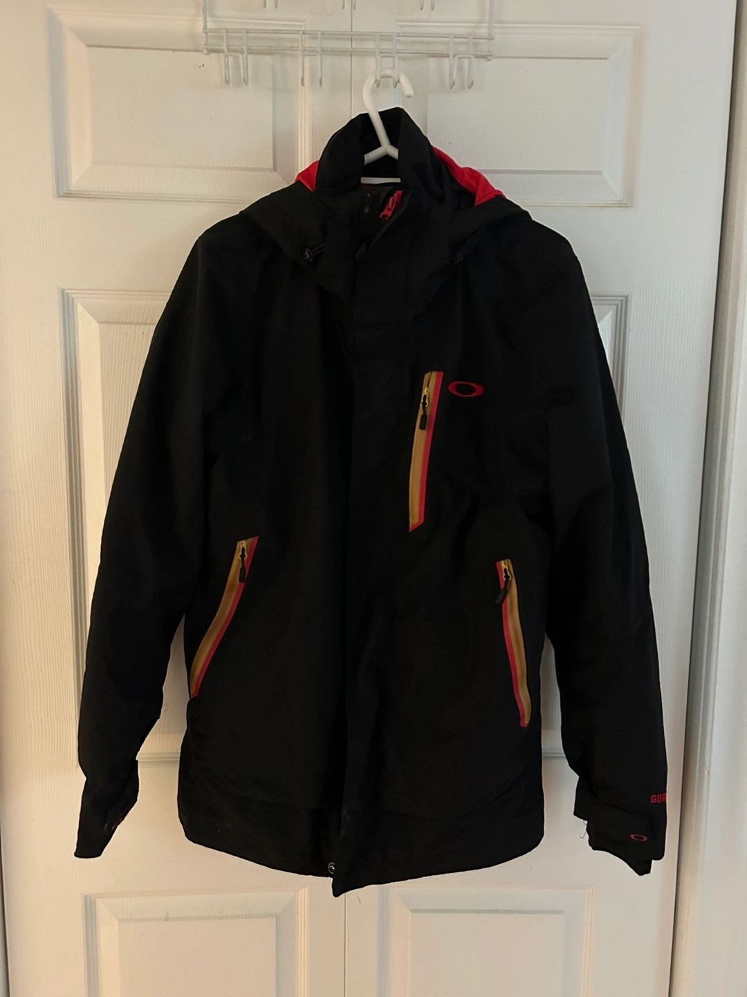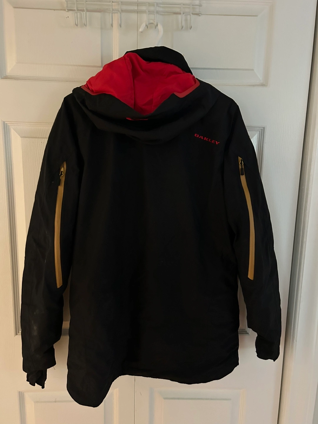 A black winter jacket. Features multiple zippered pockets. Red and tan accents are visible. The jacket has a hood. Perfect for your outdoor adventures, you can relax and enjoy the warmth of the coat.