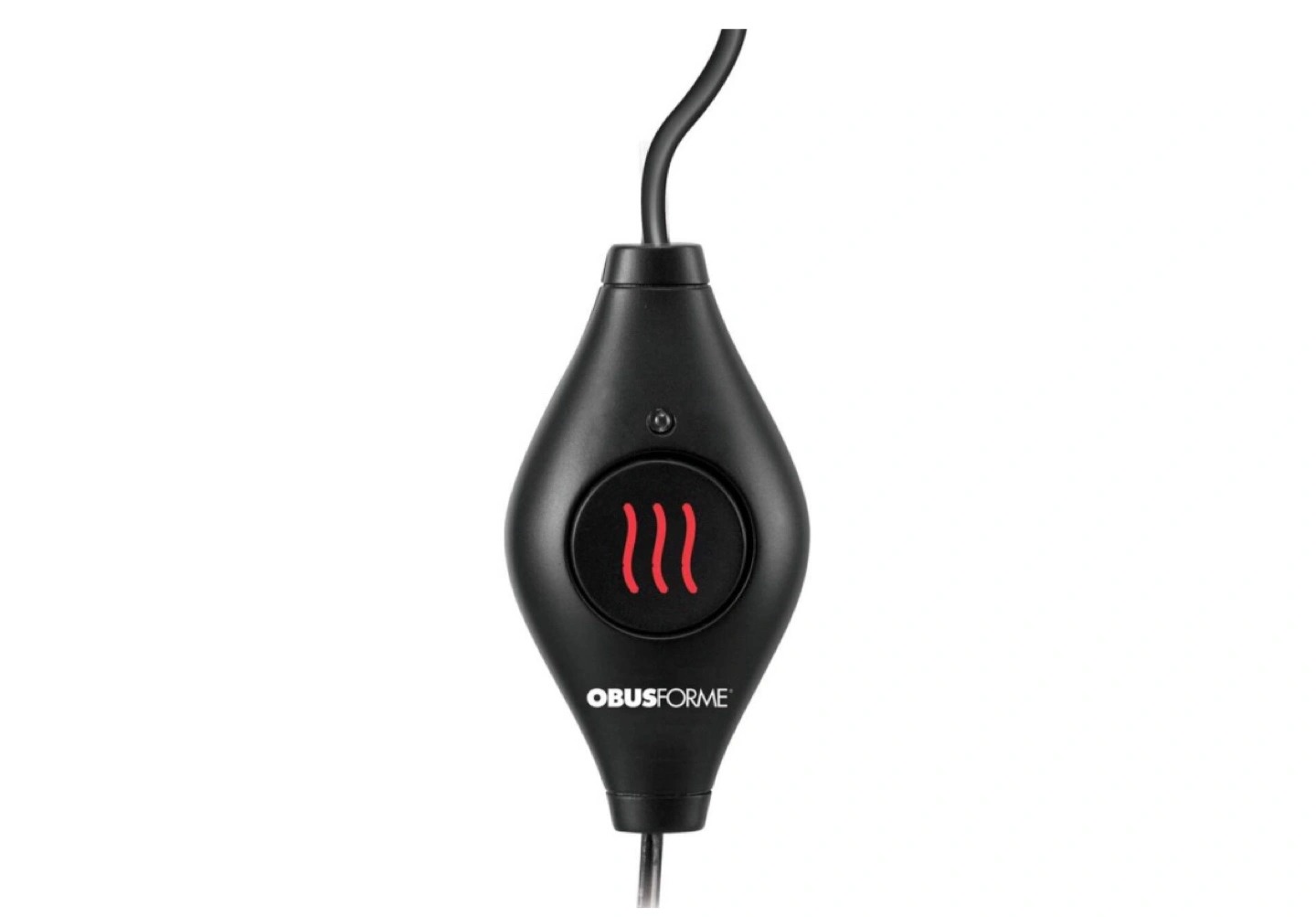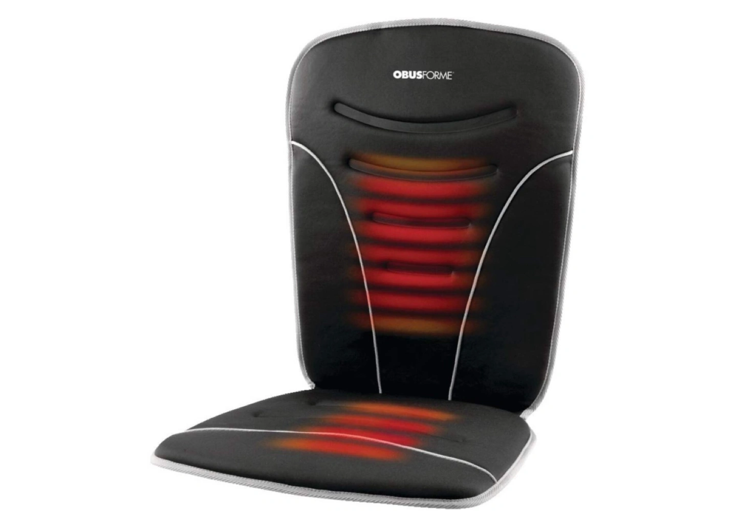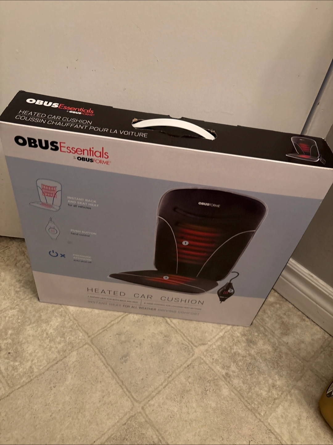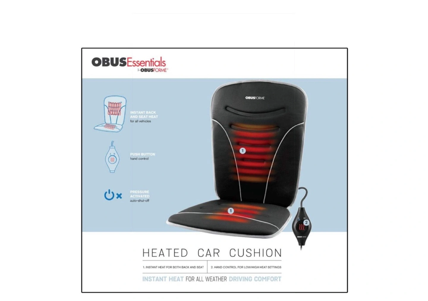 The ObusForme Back & Seat Heated Car Cushion in box Product Features: • Designed to warm your back and legs with rapid-heating power. • Features a push-button control for easy operation. • Suitable for use in vehicles to enhance comfort during cold weather.