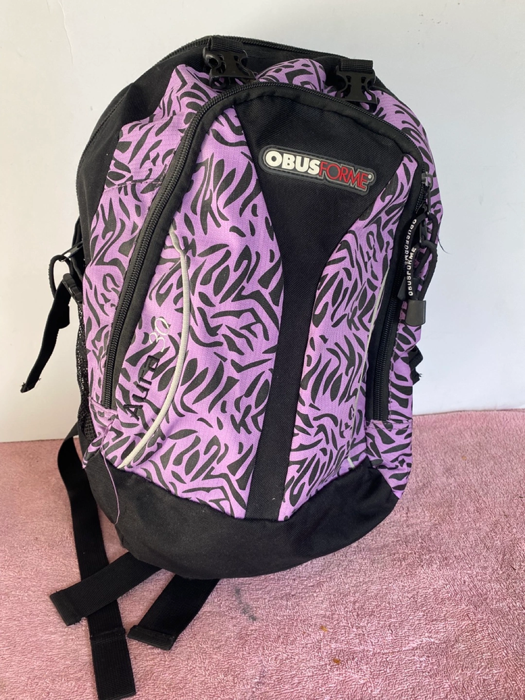 Looking to sell this ObusForme backpack! It features a unique purple and black pattern. It has a comfort support system and adjustable straps. Perfect for school, hiking, or everyday use