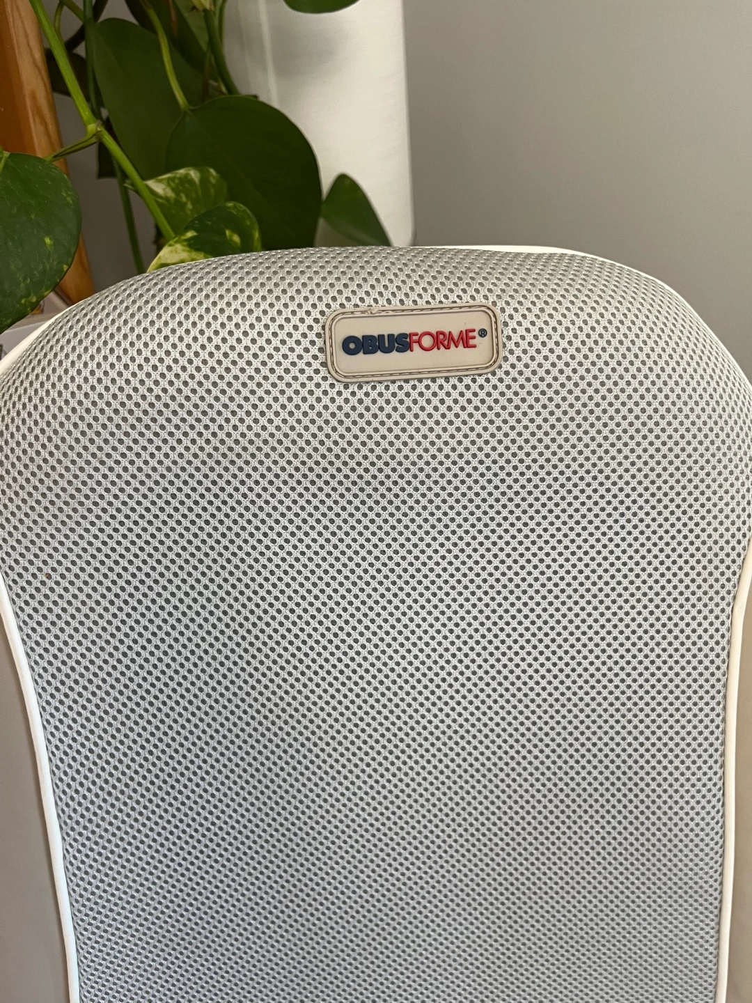 Selling an ObusForme massage seat cushion. It comes with a remote control that has buttons for power, mode, and heat. Perfect for relaxing after a long day!