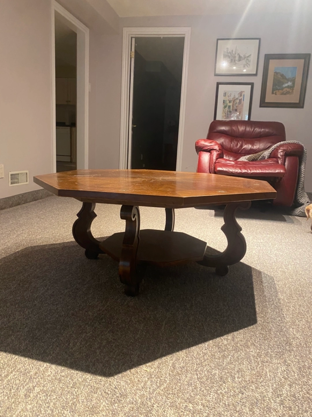 Selling a wooden octagon-shaped coffee table. It features a unique design with carved legs and a lower shelf for storage or display. It's a sturdy and stylish piece that would look great in any living room!