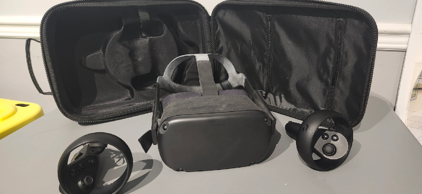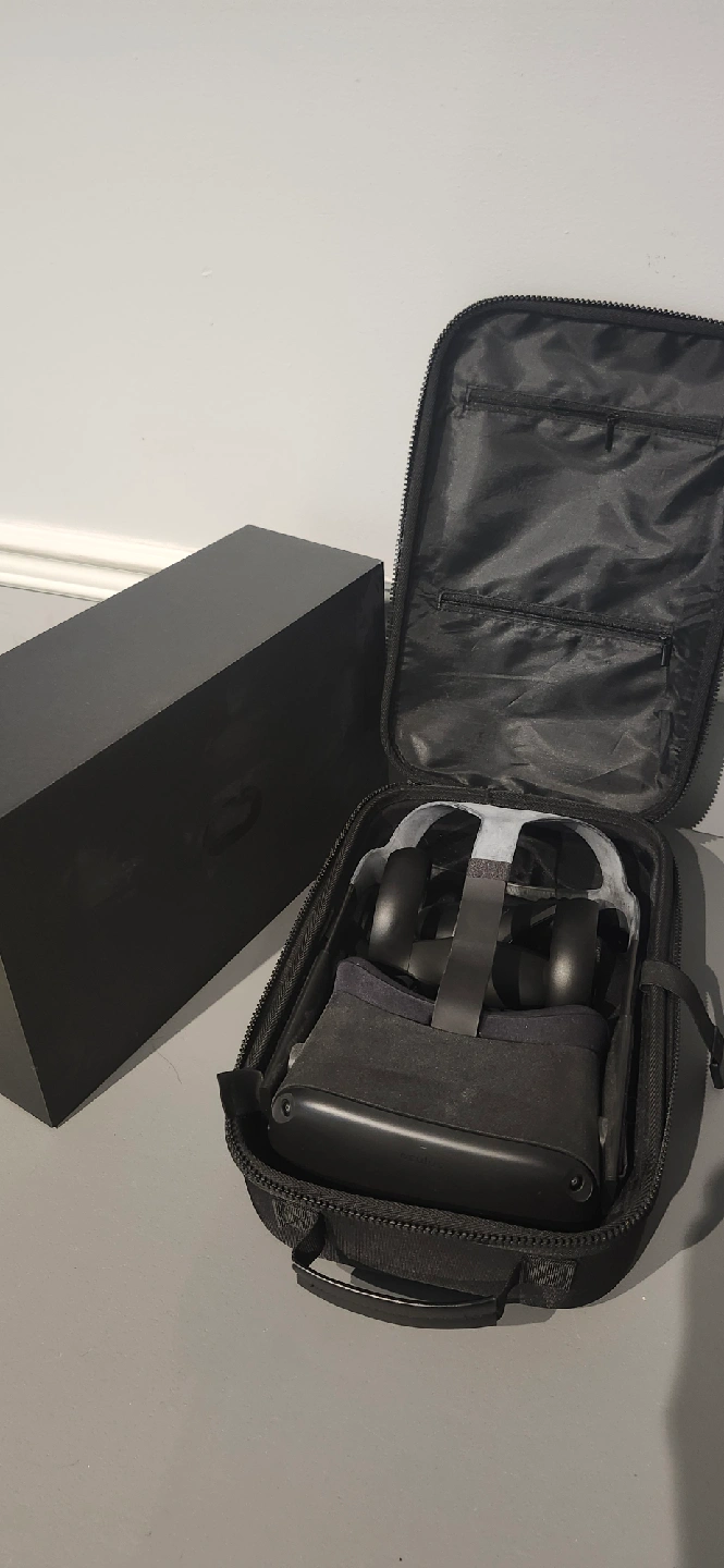 Selling an Oculus Quest VR headset. It comes with the controllers and a handy carrying case to keep everything together. Great for immersive gaming and virtual experiences!