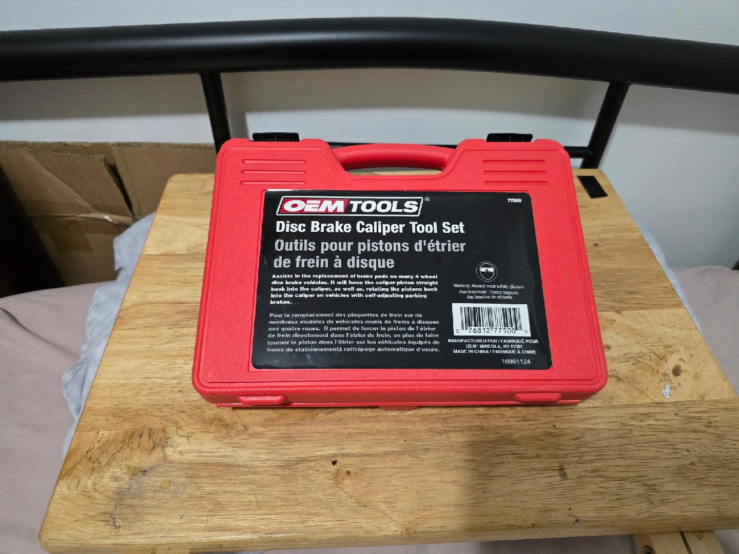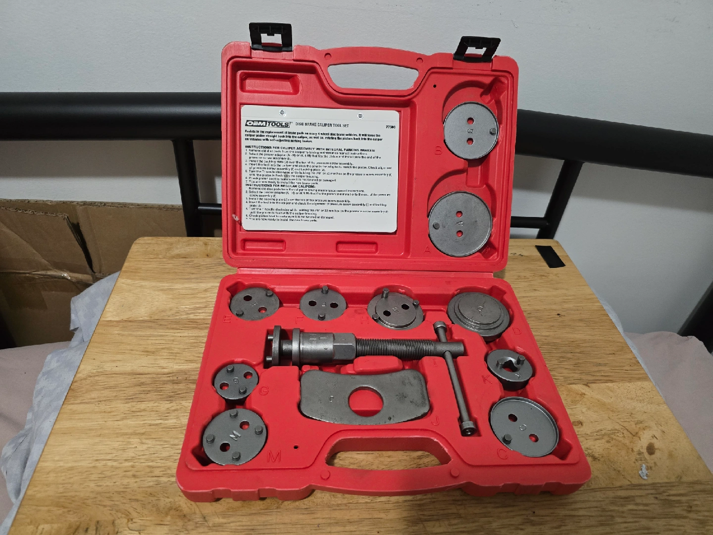 Selling an OEM TOOLS disc brake caliper tool set. It's designed to assist in the replacement of brake pads on many wheel disc brake vehicles. This tool will force the caliper piston straight back into the caliper on vehicles with self-adjusting parking brakes