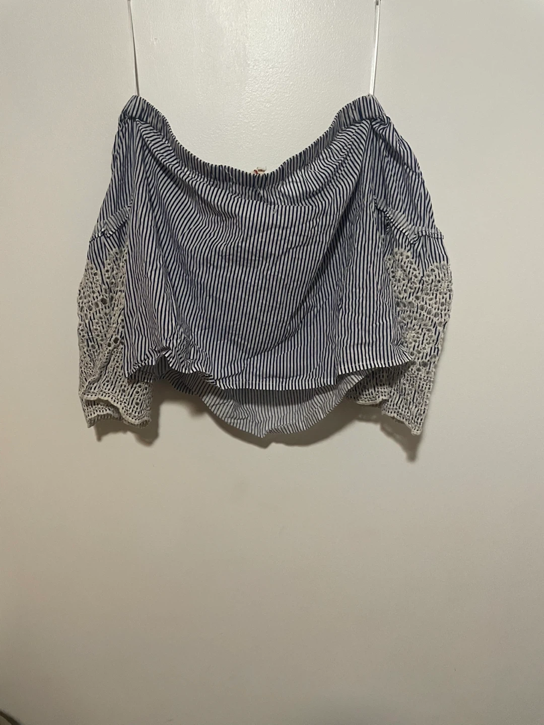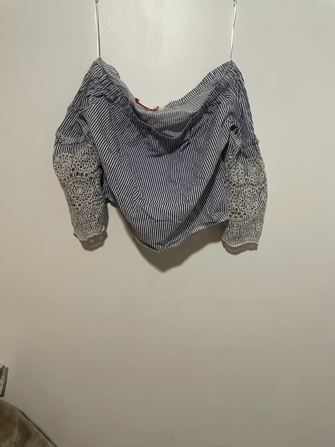Here's a cute off-the-shoulder blouse with a striped pattern! It features lace detailing on the sleeves, adding a touch of elegance to the design. This top is perfect for a casual yet stylish look