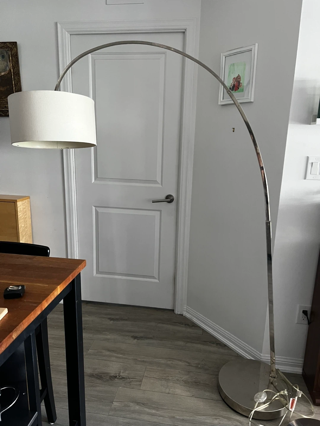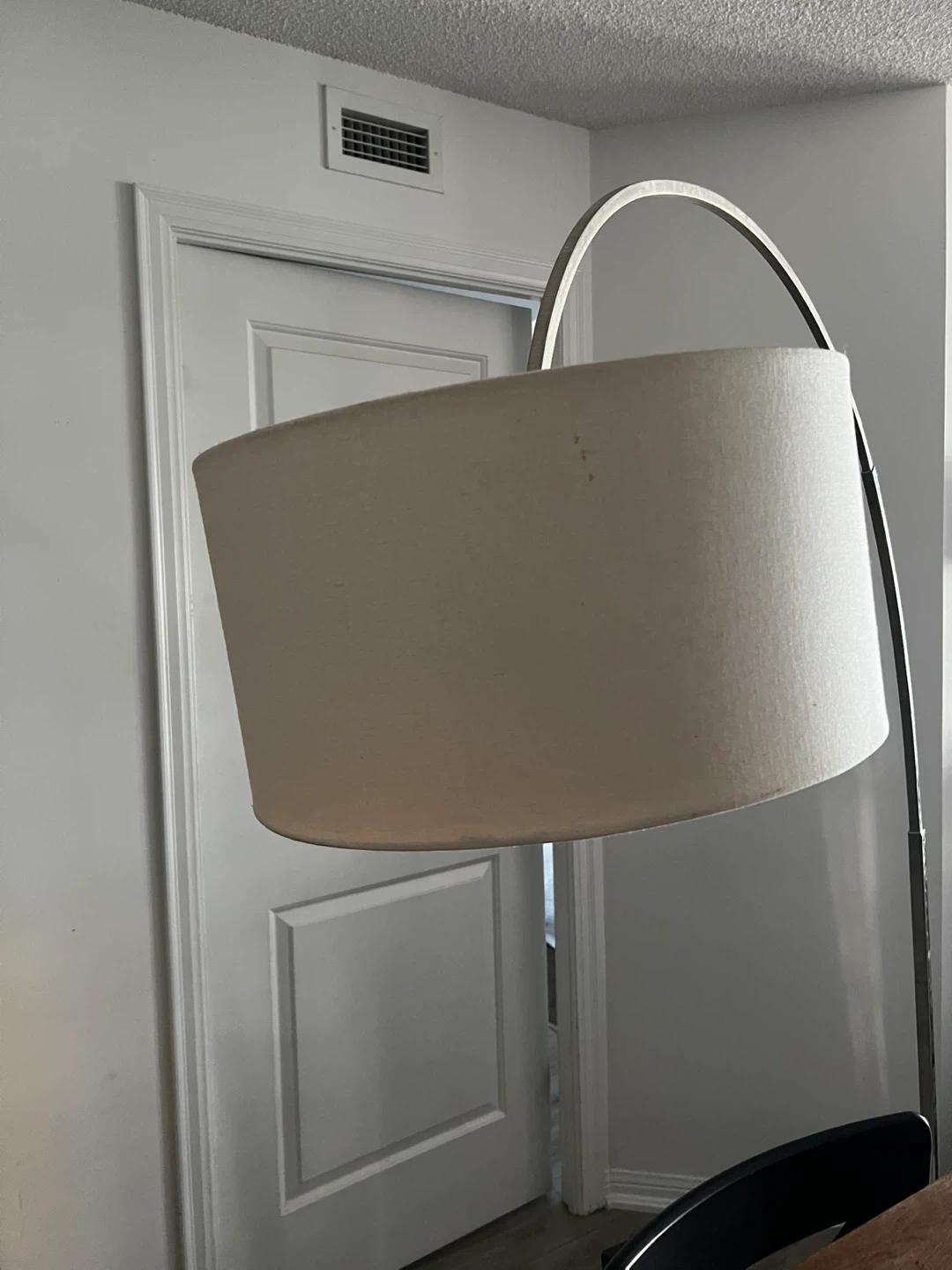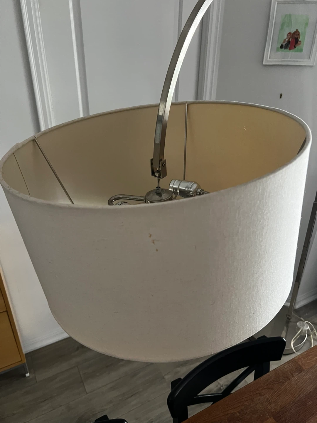 Floor lamp for sale with 15 inch base and beige lampshade measuring 19 inches in diameter. Place for two lightbulbs. The base is quite heavy, so make sure you have a vehicle to transport as I’m sure it’s concrete. Requires tightening at base so it hangs quite low. It is the buyer‘s responsibility to dismantle if required as there are two areas where the lamp pole can be unscrewed and folded for easier transport. Small orange stain, which is barely noticeable on the lampshade.