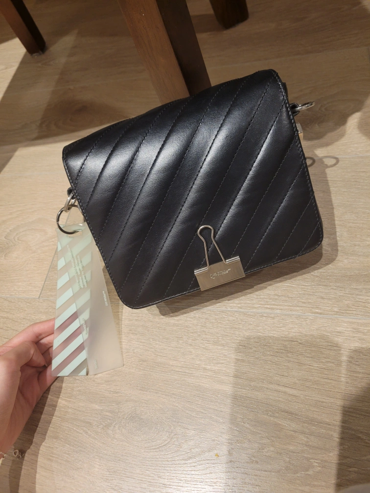 Authentic Off-White Clip bag in an excellent condition ๐๐ป Black leather shoulder bag with silver hardware. Features a silver paperclip closure. Includes a removable strap and a small interior pocket.