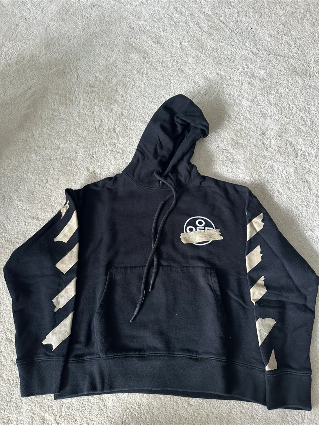 Selling a used Off-White black hoodie. It's in great shape and ready for a new home! The hoodie features the iconic Off-White design with stripes on the sleeves and the arrow logo on the back. It is made of comfortable material and is perfect for casual wear.
