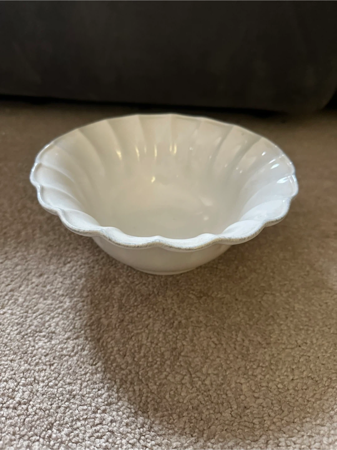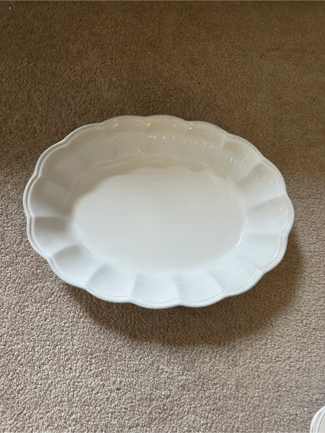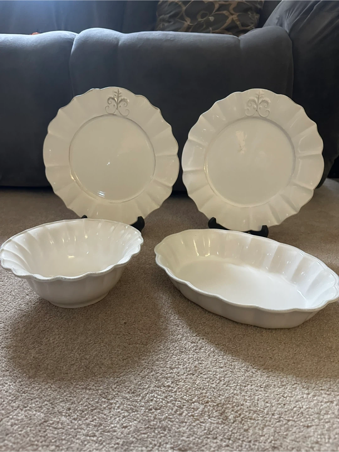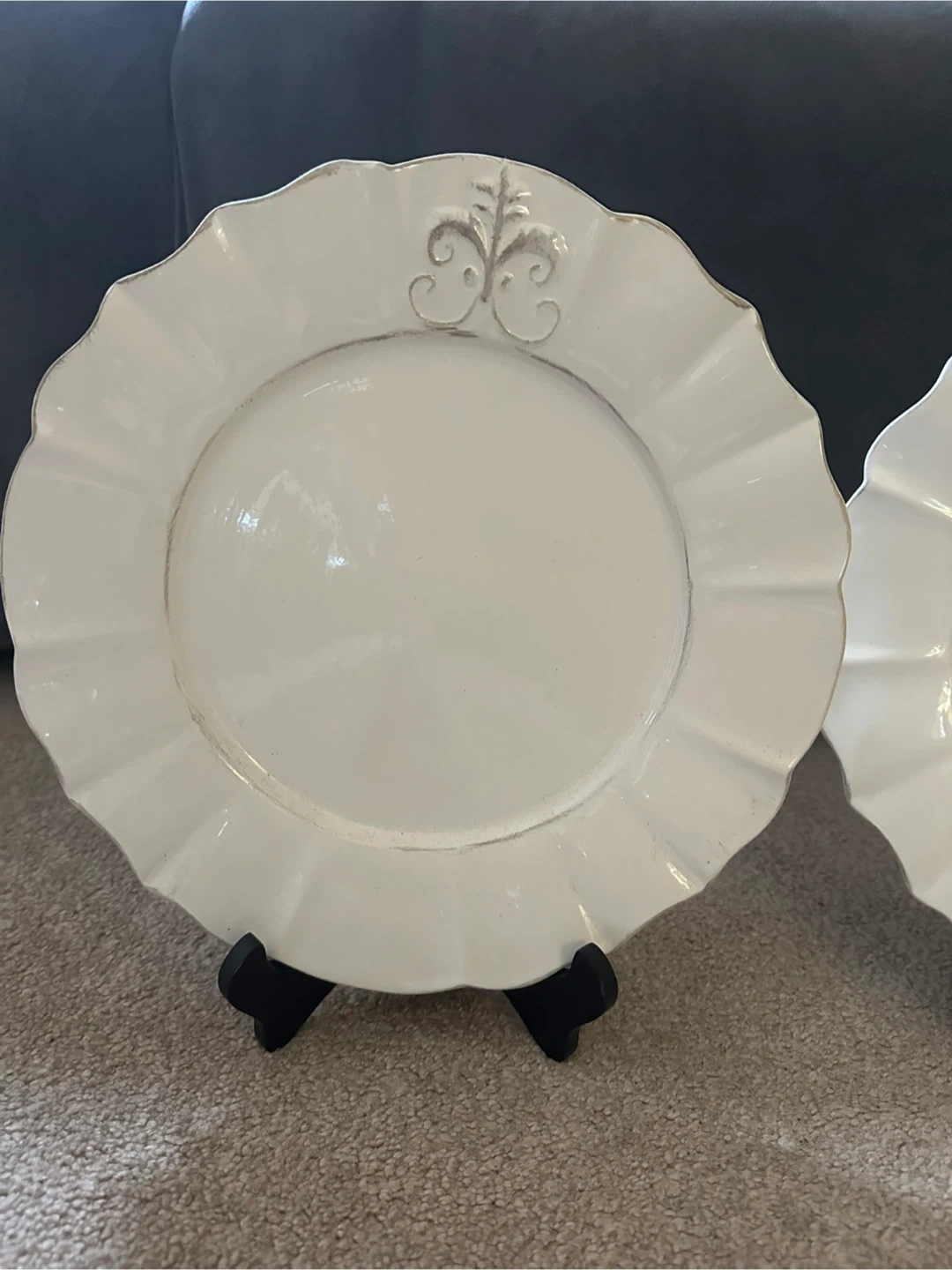 Selling a set of decorative off-white plates and a bowl. These are in great condition and would look lovely in any home. Perfect for adding a touch of elegance to your dining or display space!