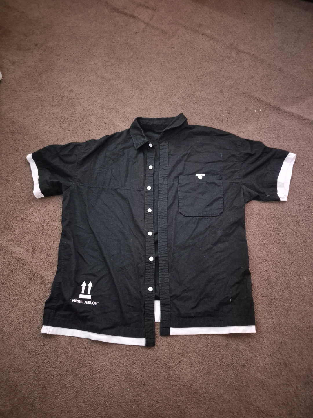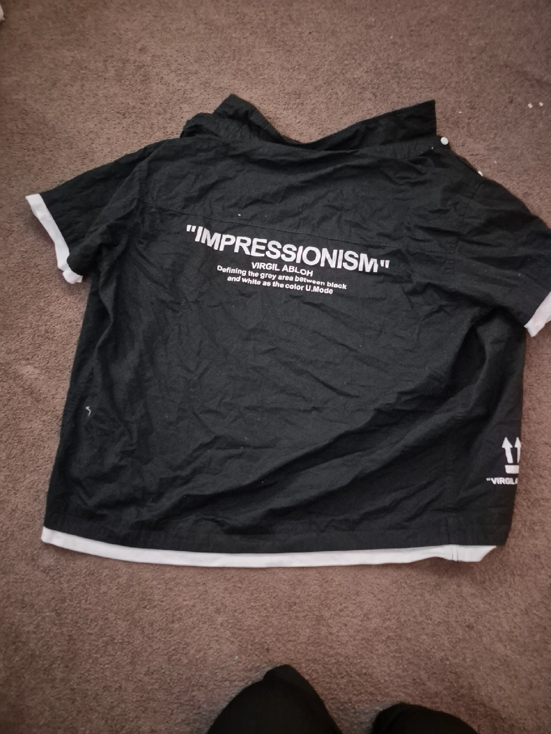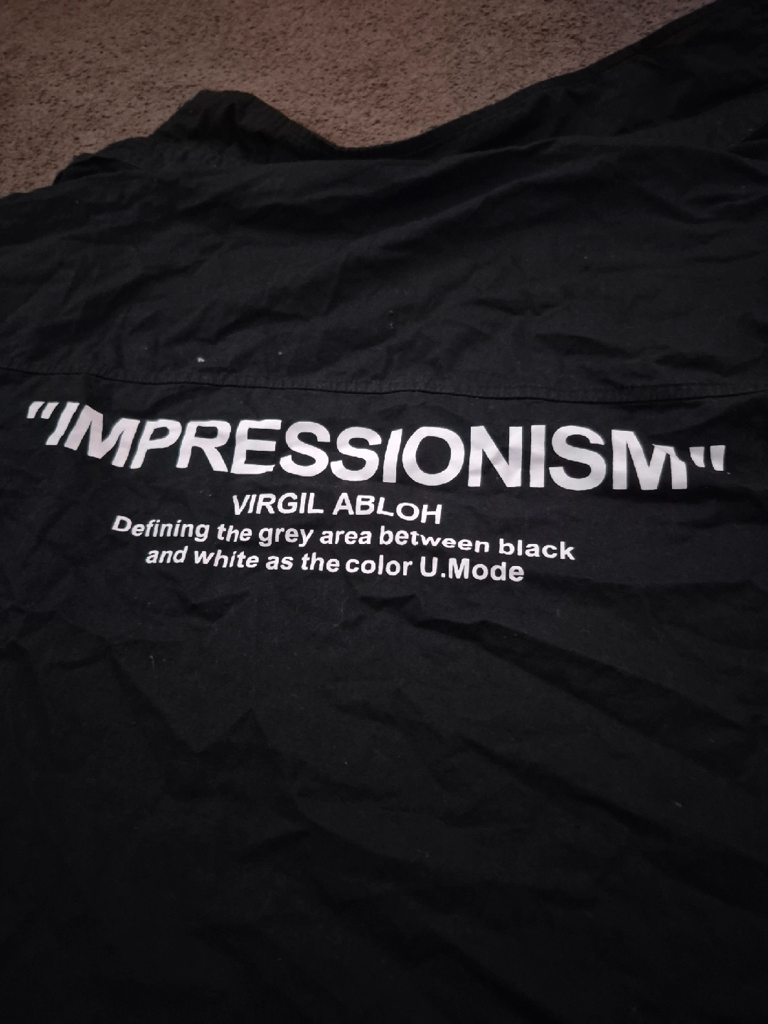 Selling an Off-White button-down shirt with the "Impressionism" design. It's black with white accents on the collar and sleeves. The shirt features the "VIRGIL ABLOH" logo. Great for adding a unique touch to your wardrobe! missing the inside tag