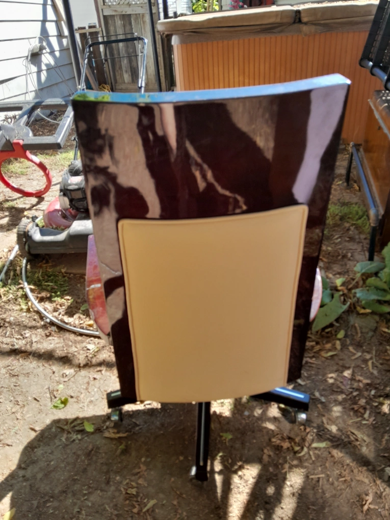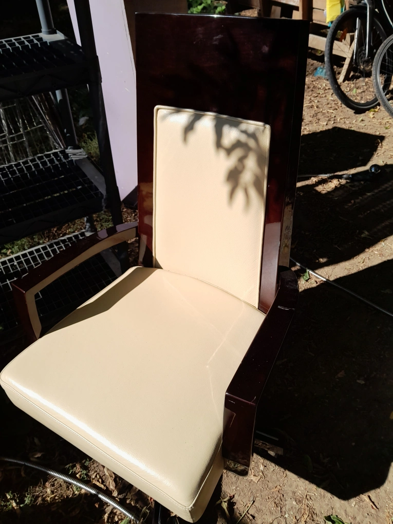 Office chair with a brown wood finish and cream-coloured seat and back. It has a classic look and would be great for a home office or study space. The chair has a sturdy base with wheels, making it easy to move around your workspace