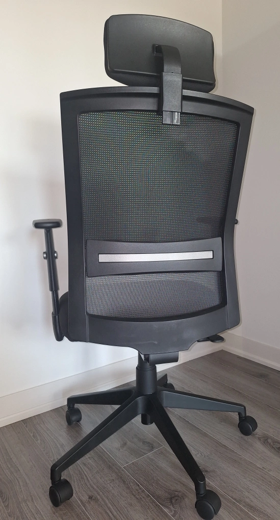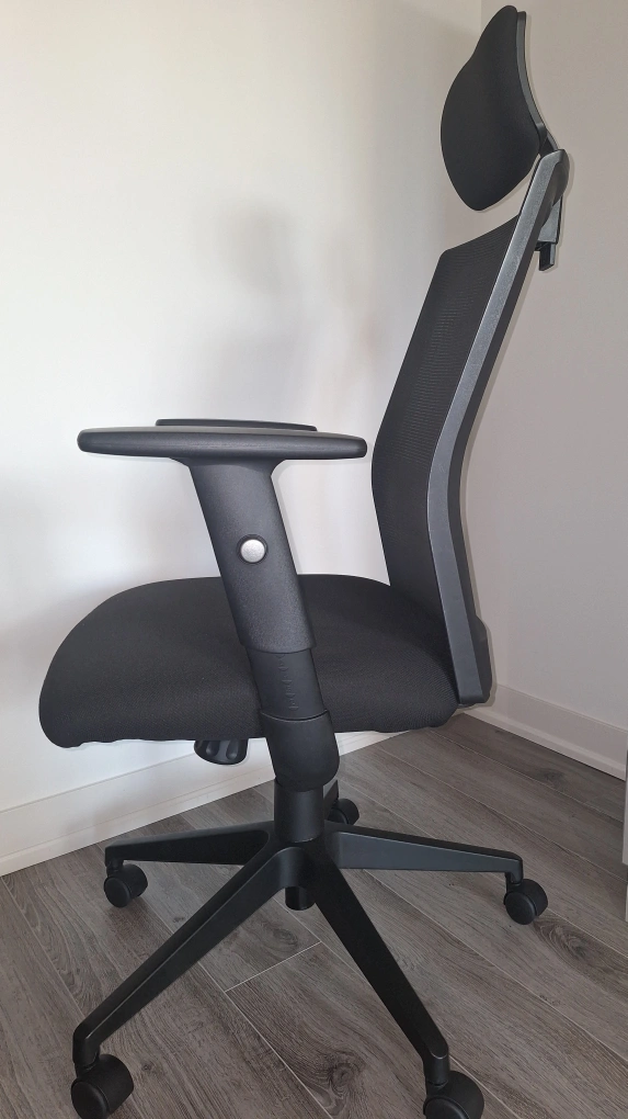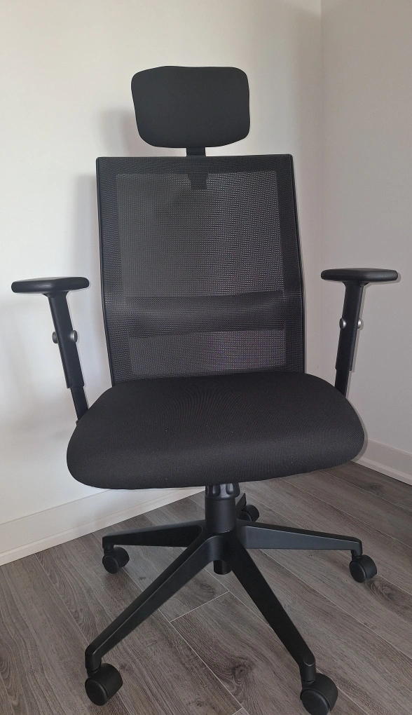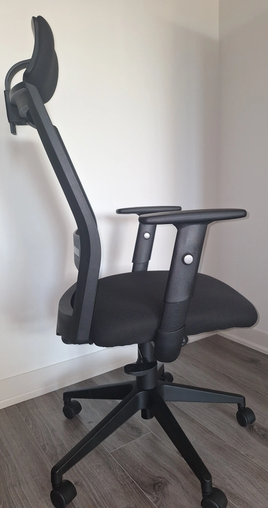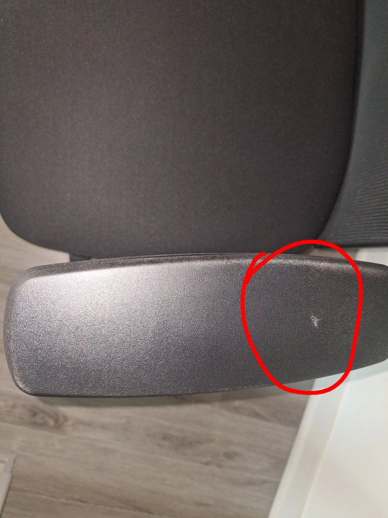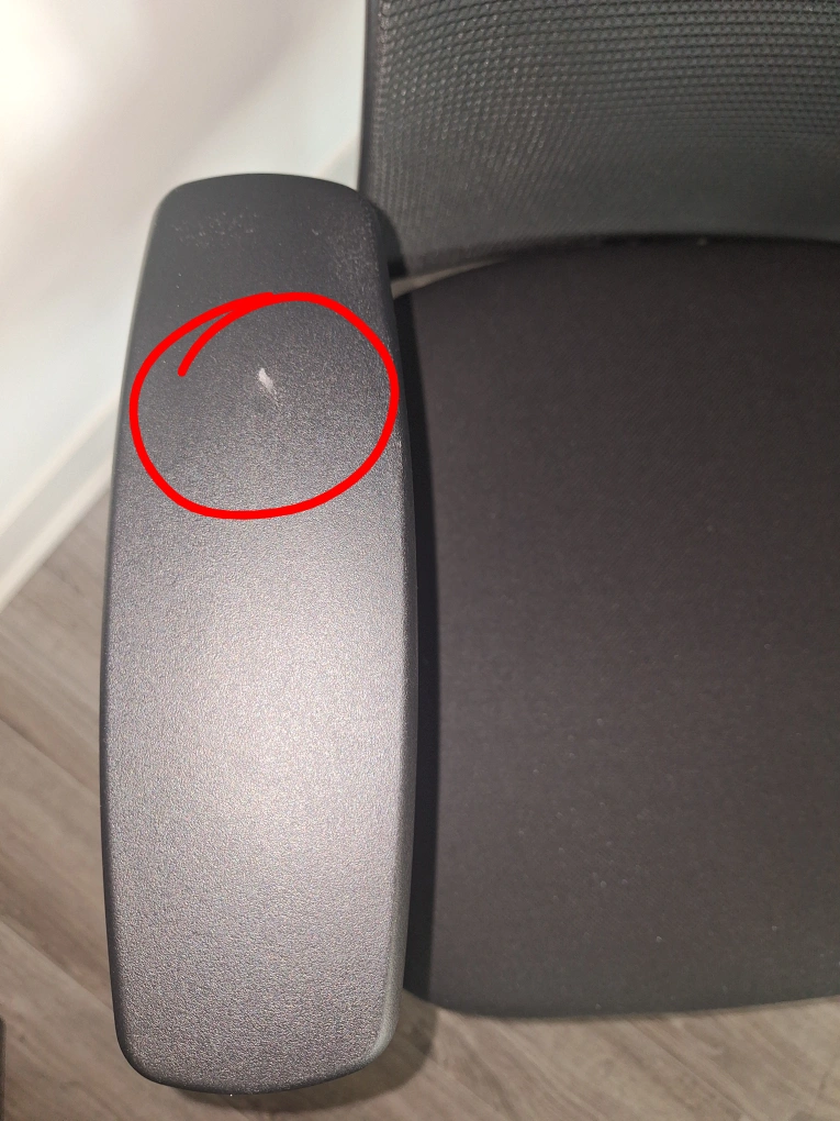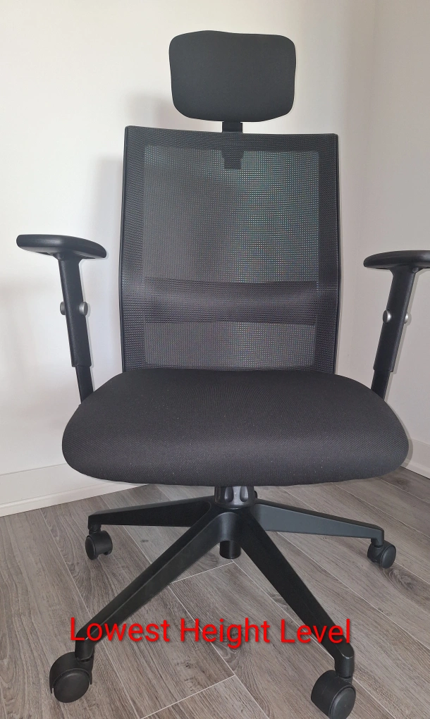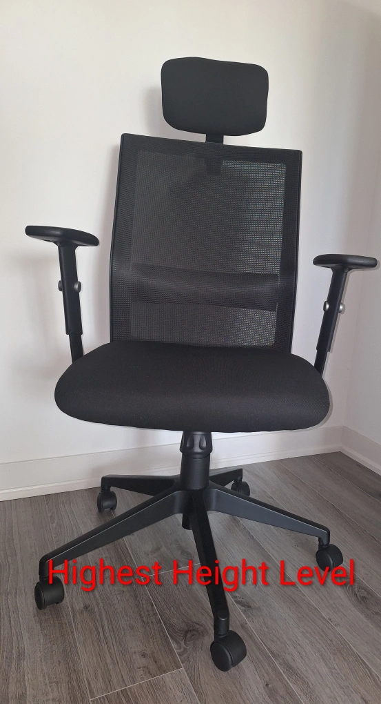 Office chair bought from Staples Adjustable hand and head rest Adjustable height level but most of the time it goes to the lowest height level (not always) when you sit down. It shouldn't be an issue for someone who likes to set it at the lowest height level. It has minor scratches. Check pictures where scratches are circled in red Pick up only