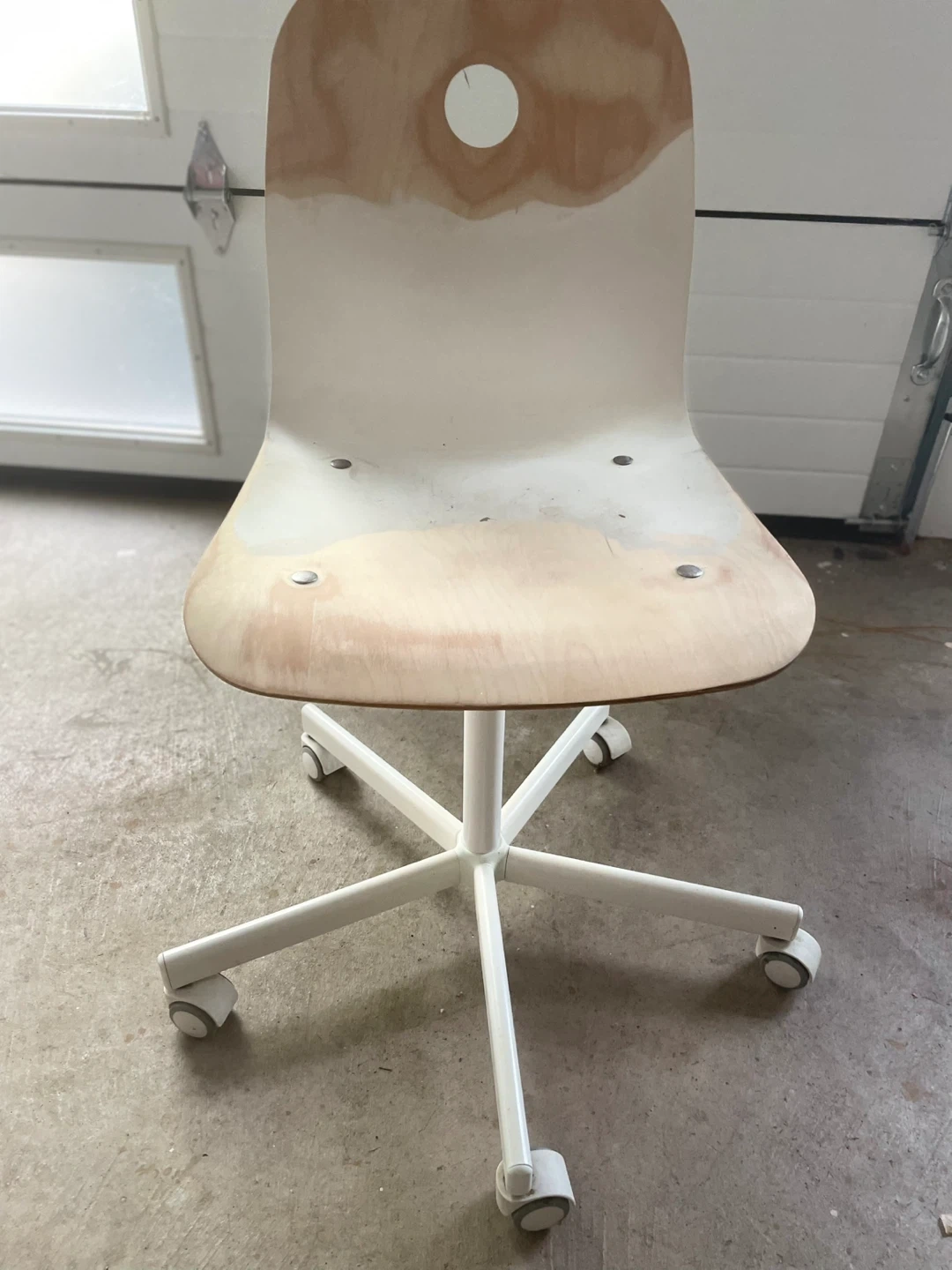 Selling a used office chair with a wooden seat and back, and a white metal base with wheels. It's perfect for a home office or study space. The chair shows some signs of wear just need to paint again and good to go but is still functional and comfortable.