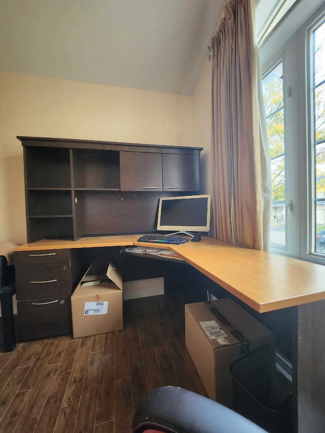 This used, L-shaped office table features a hutch with ample storage and a sturdy build, perfect for any home office setup. The desk is a practical workstation with a large surface area. There is some cosmetic wear from use. * L-shaped design * Hutch with storage cabinets and shelves * Spacious work surface