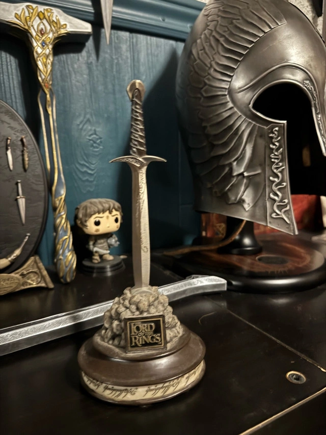 I am selling an official Sting letter opener and stand, a must-have for any Lord of the Rings collector. This detailed replica of Sting, Frodo's sword, comes with its display stand, perfect for showcasing on a desk or shelf. This has been displayed, but is in good condition. Sting itself measures approximately 8 inches in length. This piece is a fantastic addition to any collection, bringing a touch of Middle-earth to your home or office. It's more than just a letter opener; it's a conversation starter and a nod to one of the greatest fantasy stories ever told! If the ad is up, it's available! Let's get this piece of the Shire to a new home!