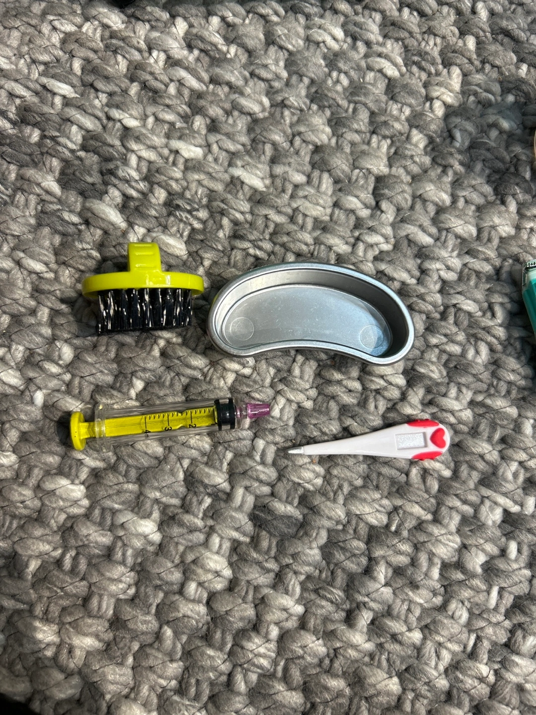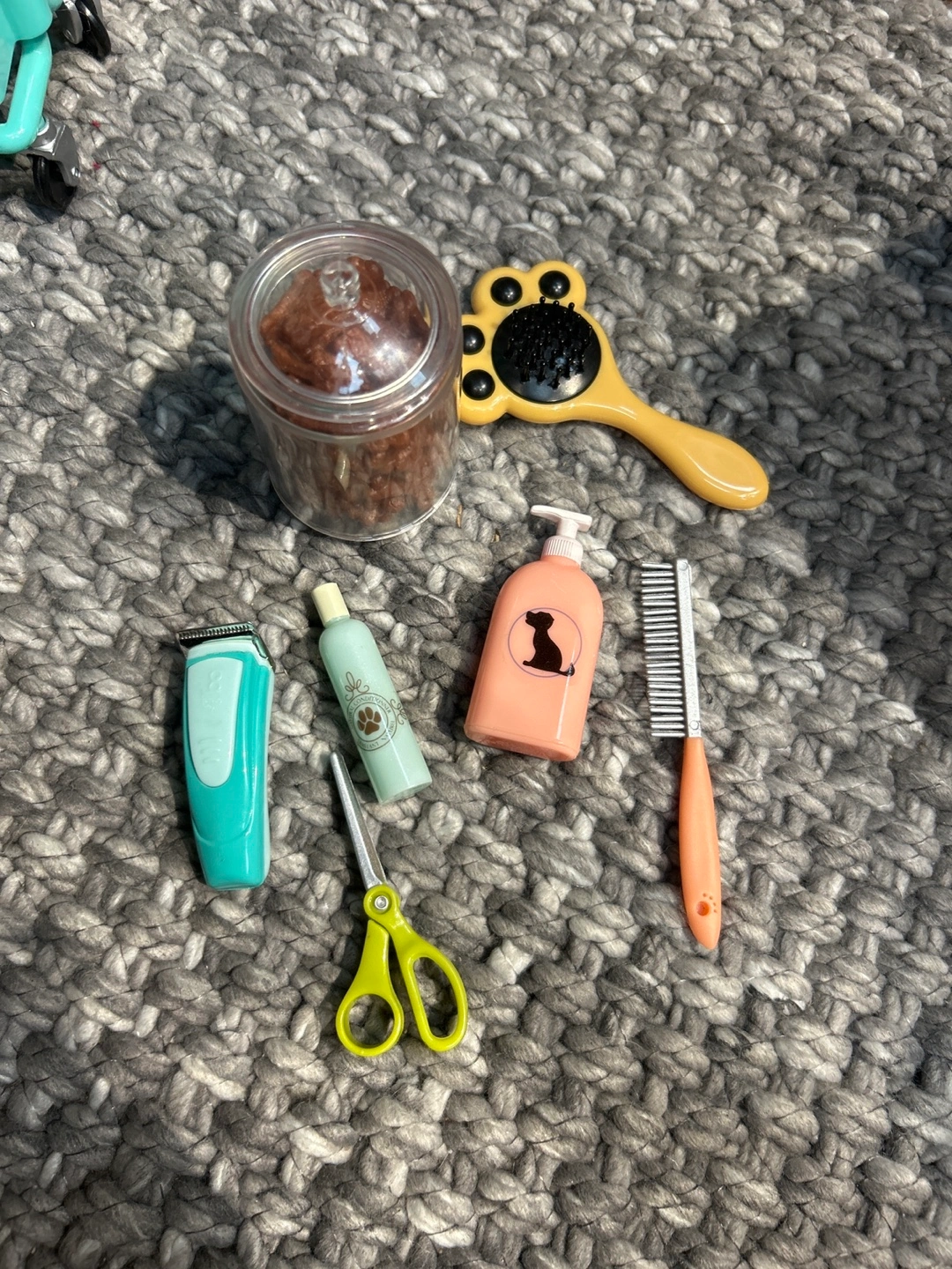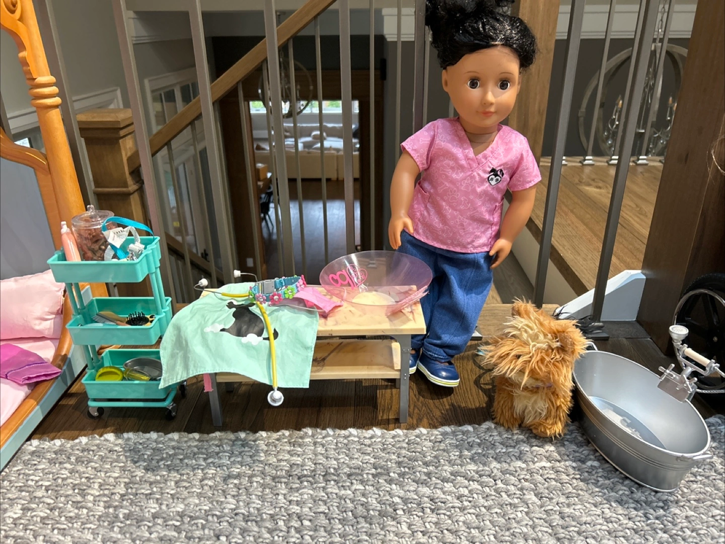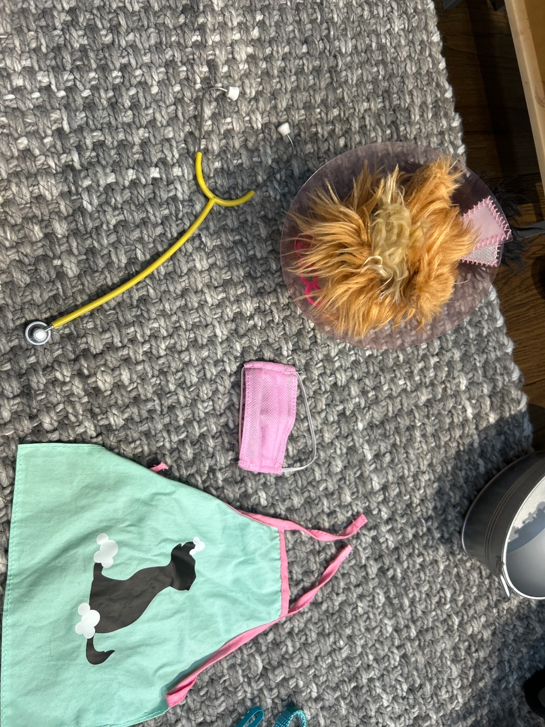 OG doll Dog Bath washing station Stethoscope Mask Hairdryer Mit Apron Two dog treat containers Syringe Thermometer Tin Razor and scissors Hairbrush, brush and comb Dog cleaning supplies Three dog collars, and two leashes Dog cone