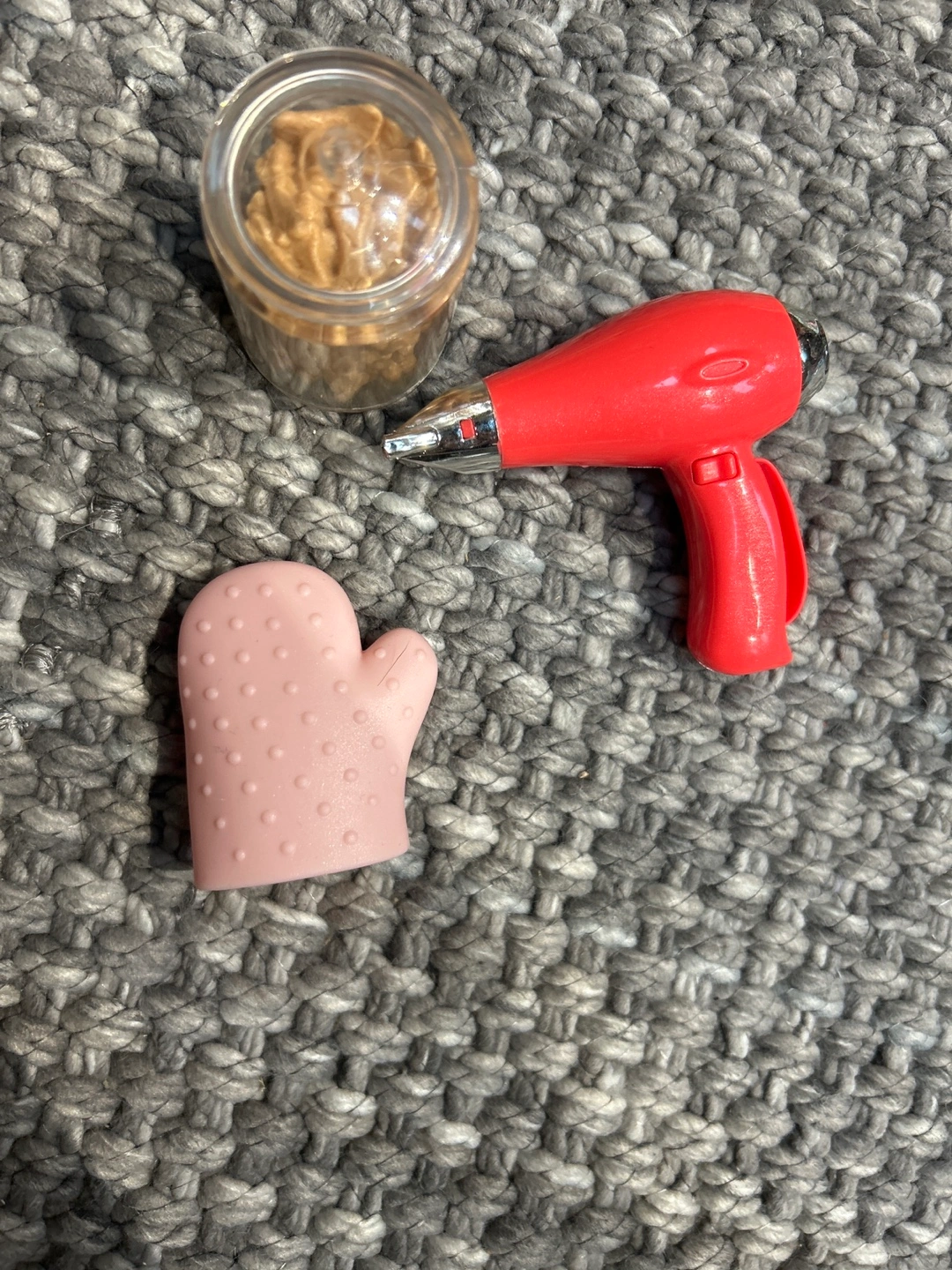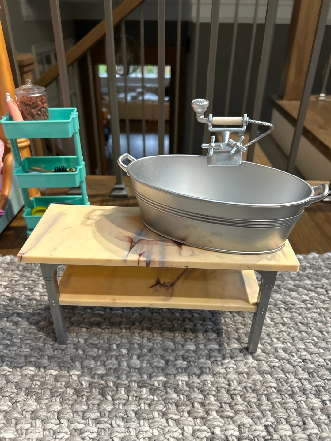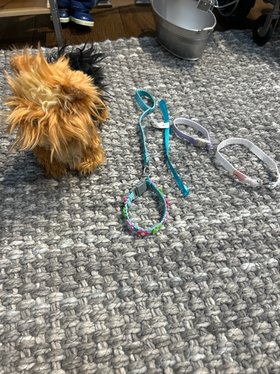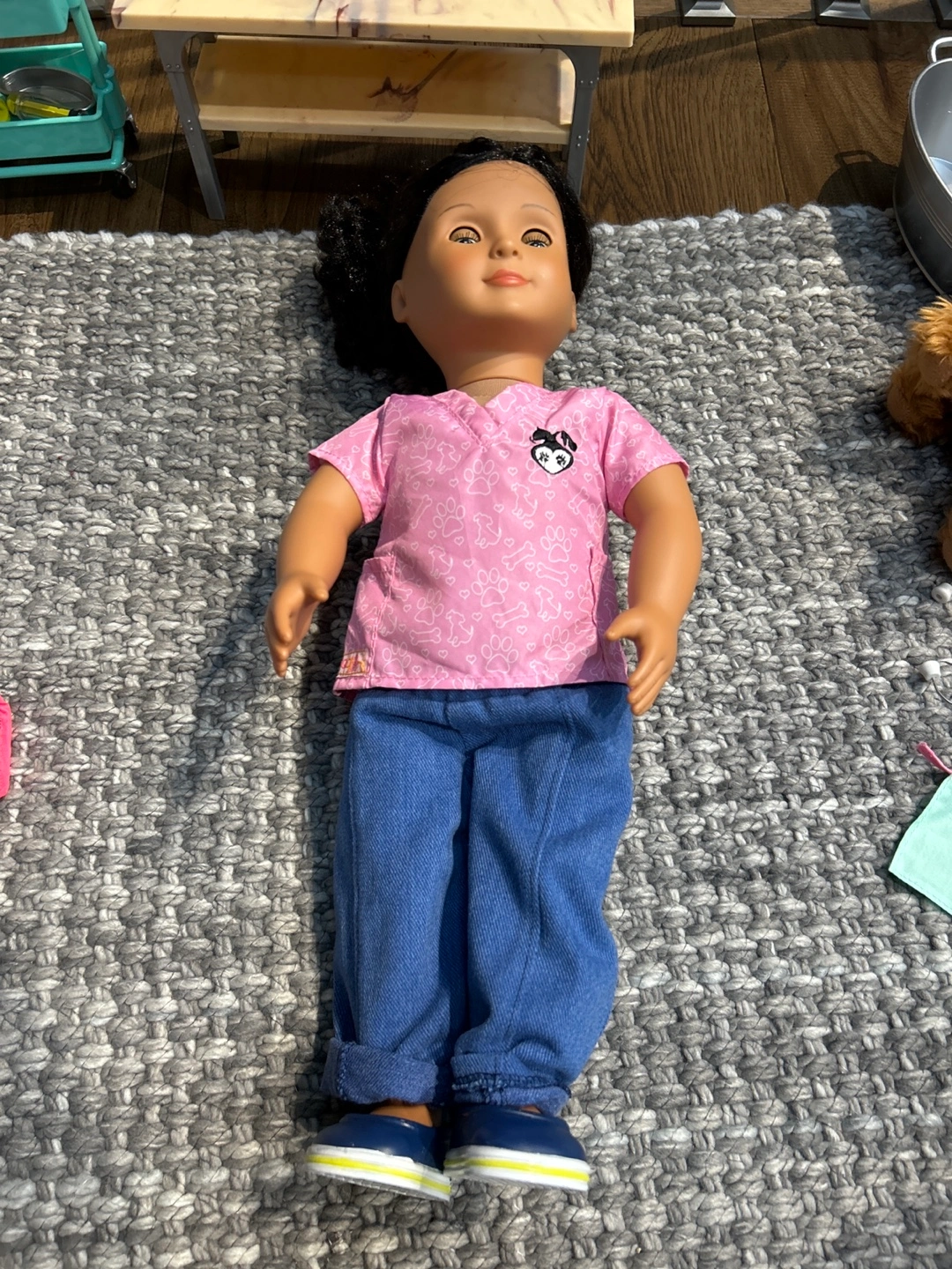 OG doll Dog Bath washing station Stethoscope Mask Hairdryer Mit Apron Two dog treat containers Syringe Thermometer Tin Razor and scissors Hairbrush, brush and comb Dog cleaning supplies Three dog collars, and two leashes Dog cone