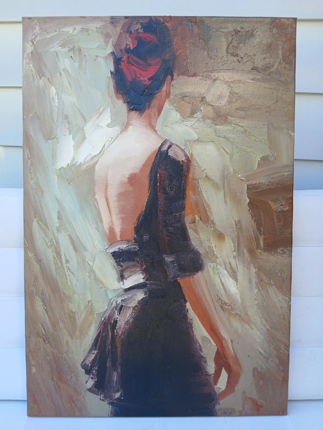 Beautiful oil painting of a woman in a black dress. The painting is framed and ready to hang. It would be a lovely addition to any home! Comes in original box, brand new