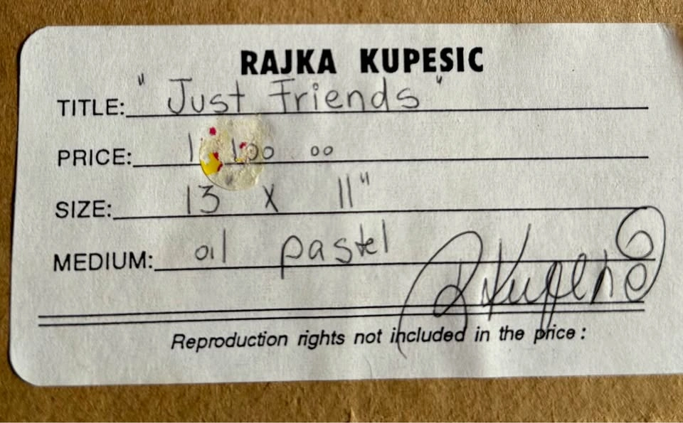 Beautiful Fine Art -RAJKA KUPESIC (CANADIAN, B.1952) JUST FRIENDS OIL PASTEL ON PAPER; SIGNED AND DATED '93 LOWER RIGHT; SIGNED AND TITLED TO ARTIST LABEL VERSO Sight, 13.5" x 10.5"