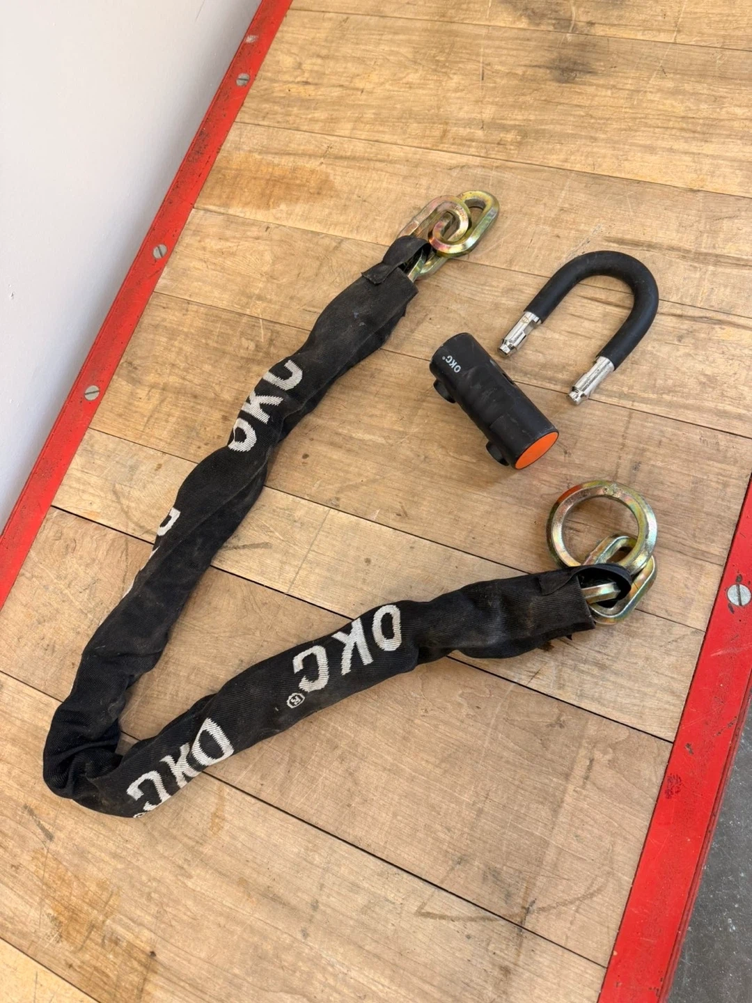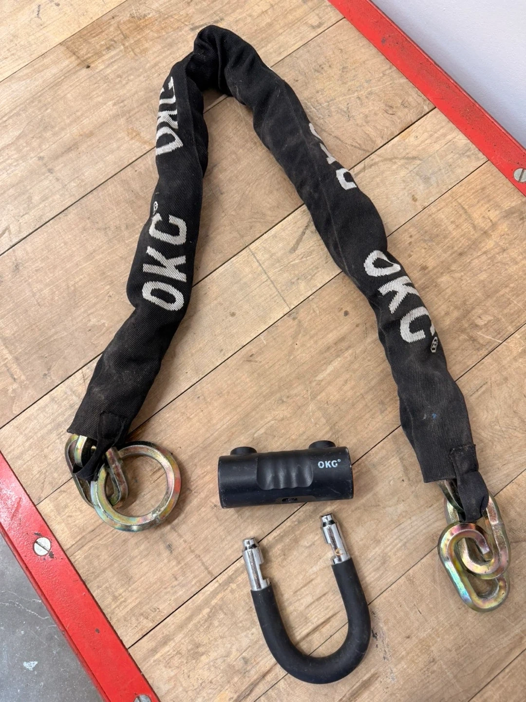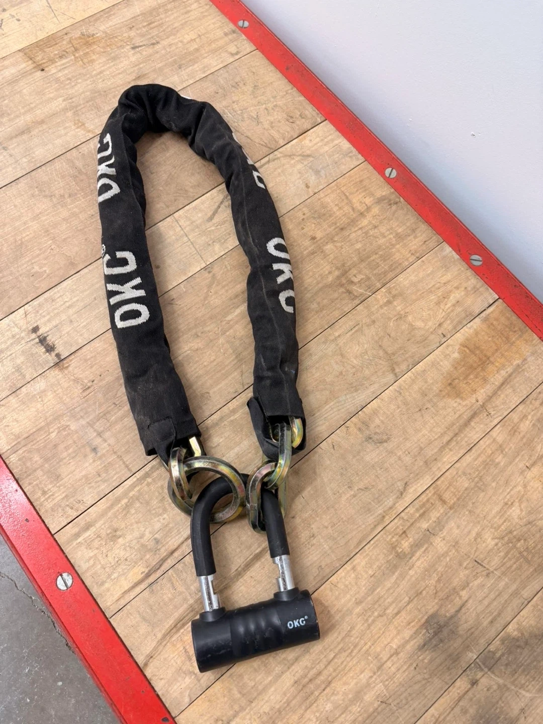 Selling an OKG chain lock. It's in good condition and ready to keep your bike or other valuables secure! It comes with the U-lock and the chain.