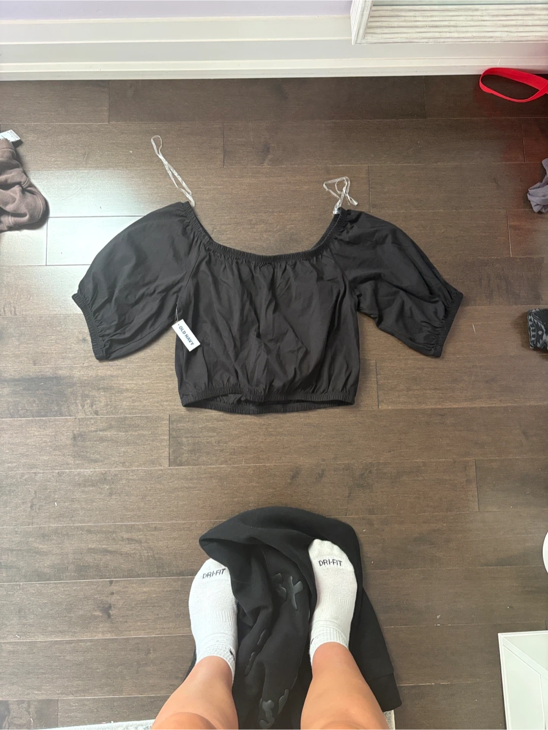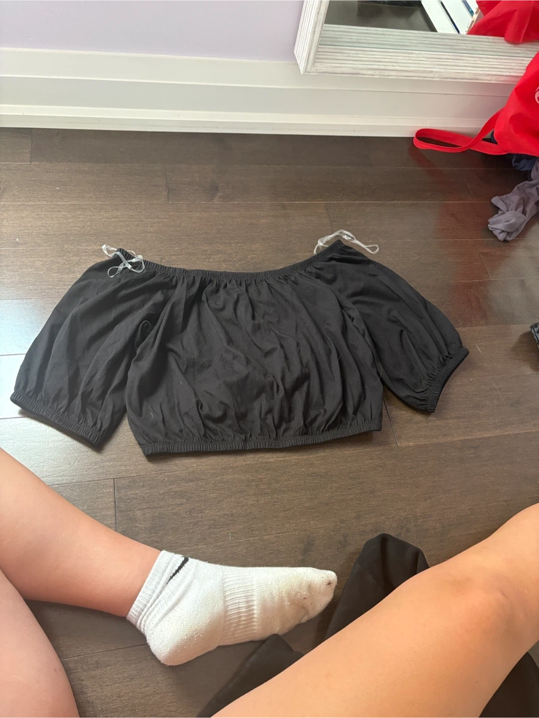 Selling a cute black off-the-shoulder crop top from Old Navy! It's in great condition and perfect for summer. The size is not indicated on the tag but it fits like a medium. It's a lightweight material, super comfy for everyday wear!