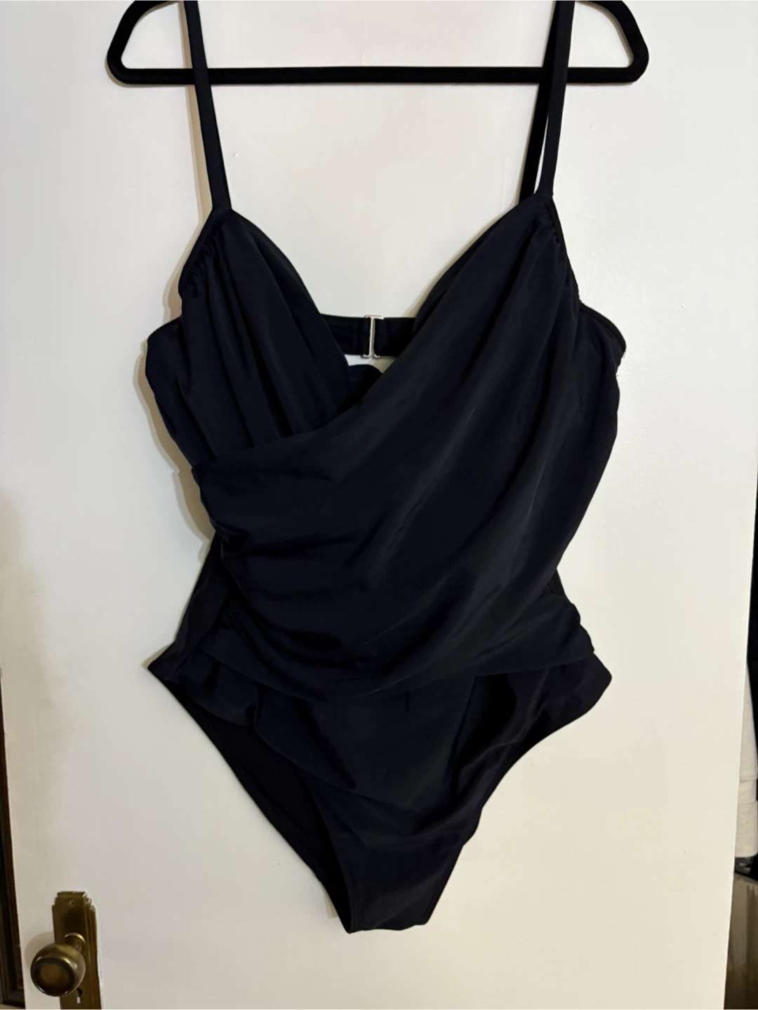 Selling a black swimsuit. It's in great condition and ready for the summer weather! Features a wrap around look with built in bra and back closure EUC