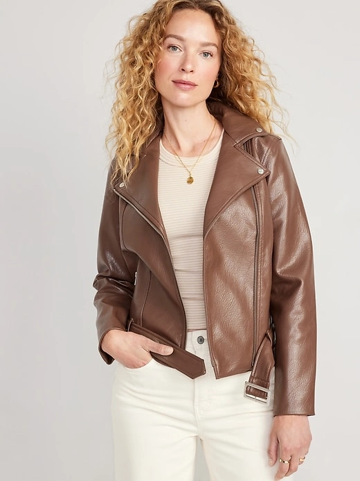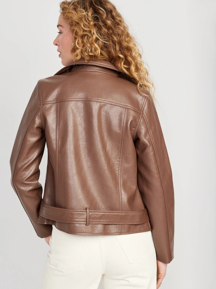 A brown faux leather jacket. Features a zipper closure. There are functional pockets on the front. Makes a great addition to an outfit for a lovely, relaxing day out. Never used, brand new.