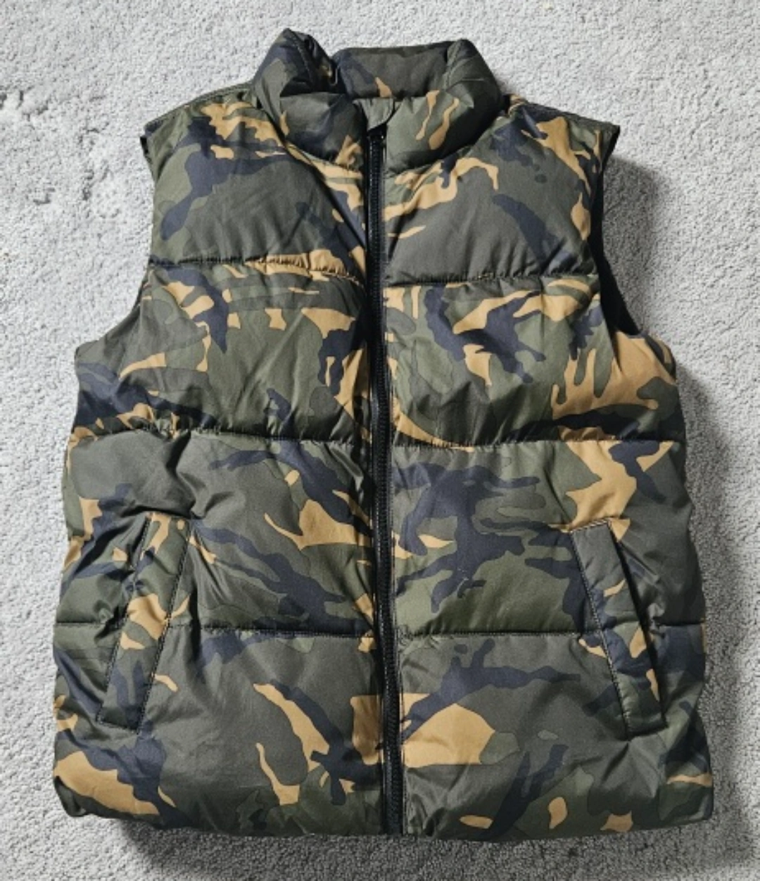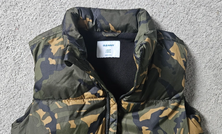 Here's an Old Navy puffer vest in a camouflage pattern. It's a size L, which fits heights of 138-152 cm. Perfect for layering on those cooler days!